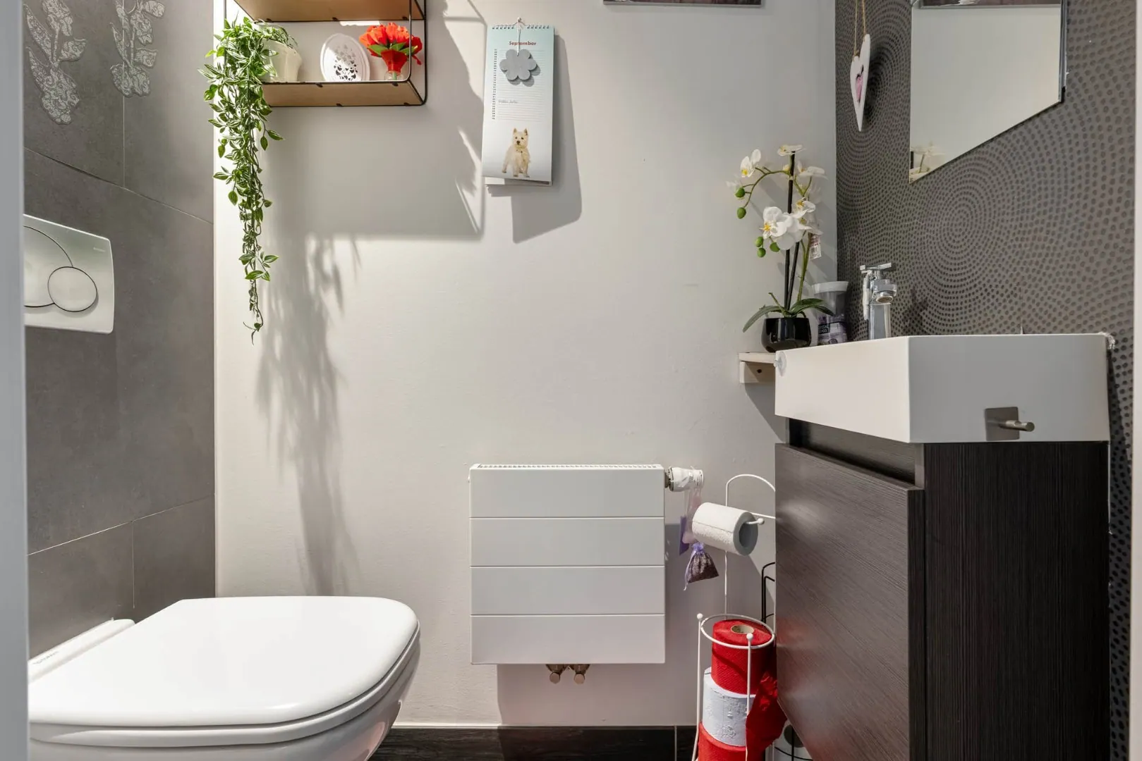 Apart toilet met tegelvloer, handwasbakje.