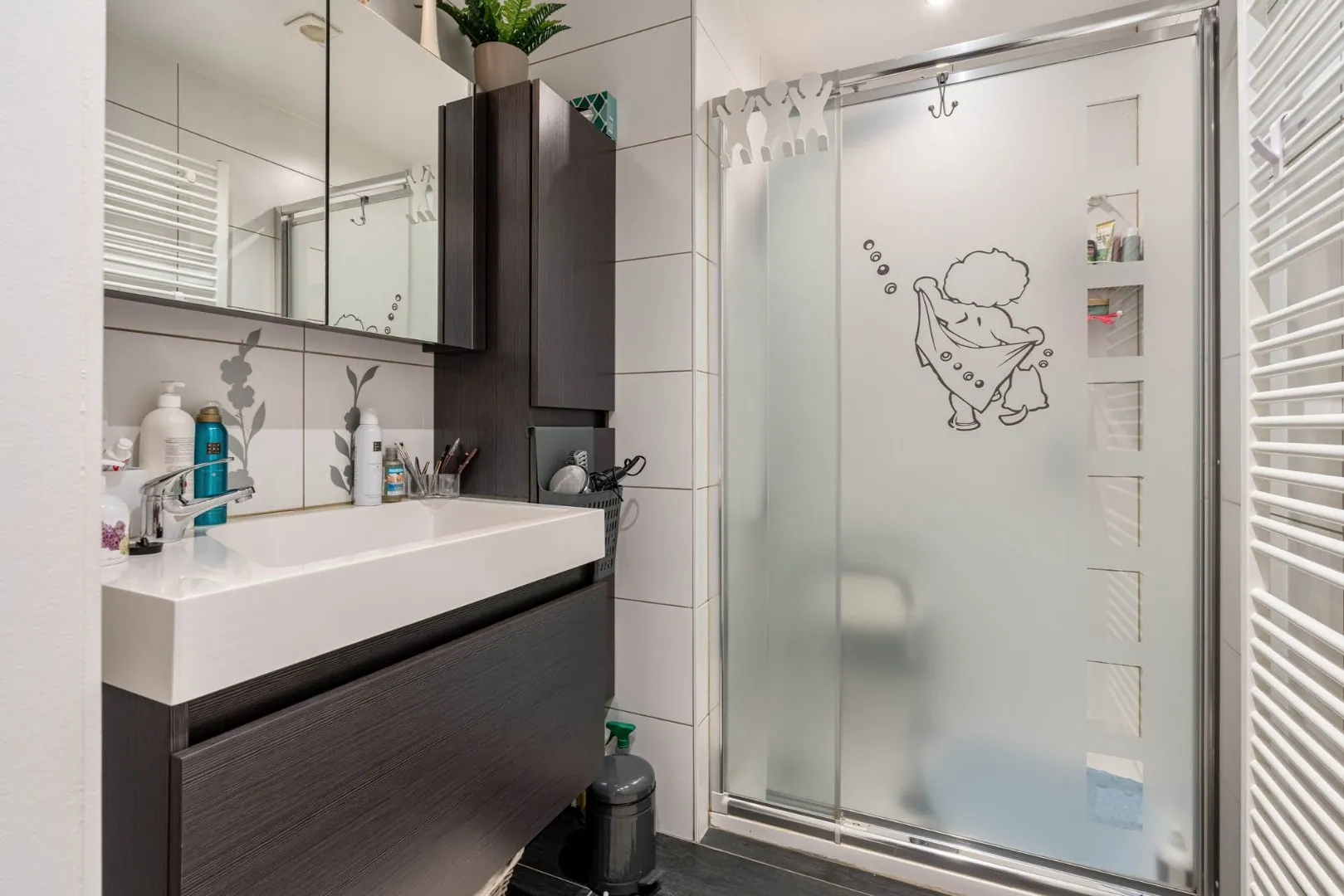 Compleet geinstalleerde badkamer met tegelvloer, douche, wastafel in badmeubel.