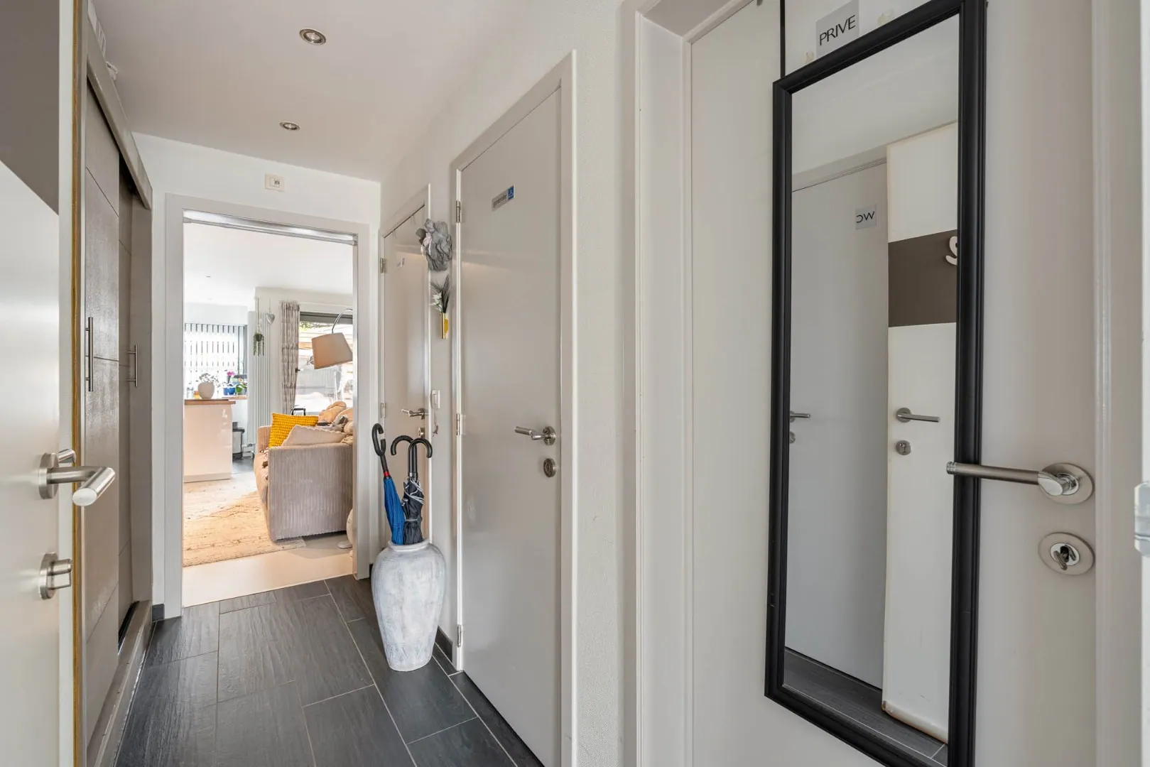 Via een centrale inkomhal, afgewerkt met natuursteen, bereiken we het appartement.