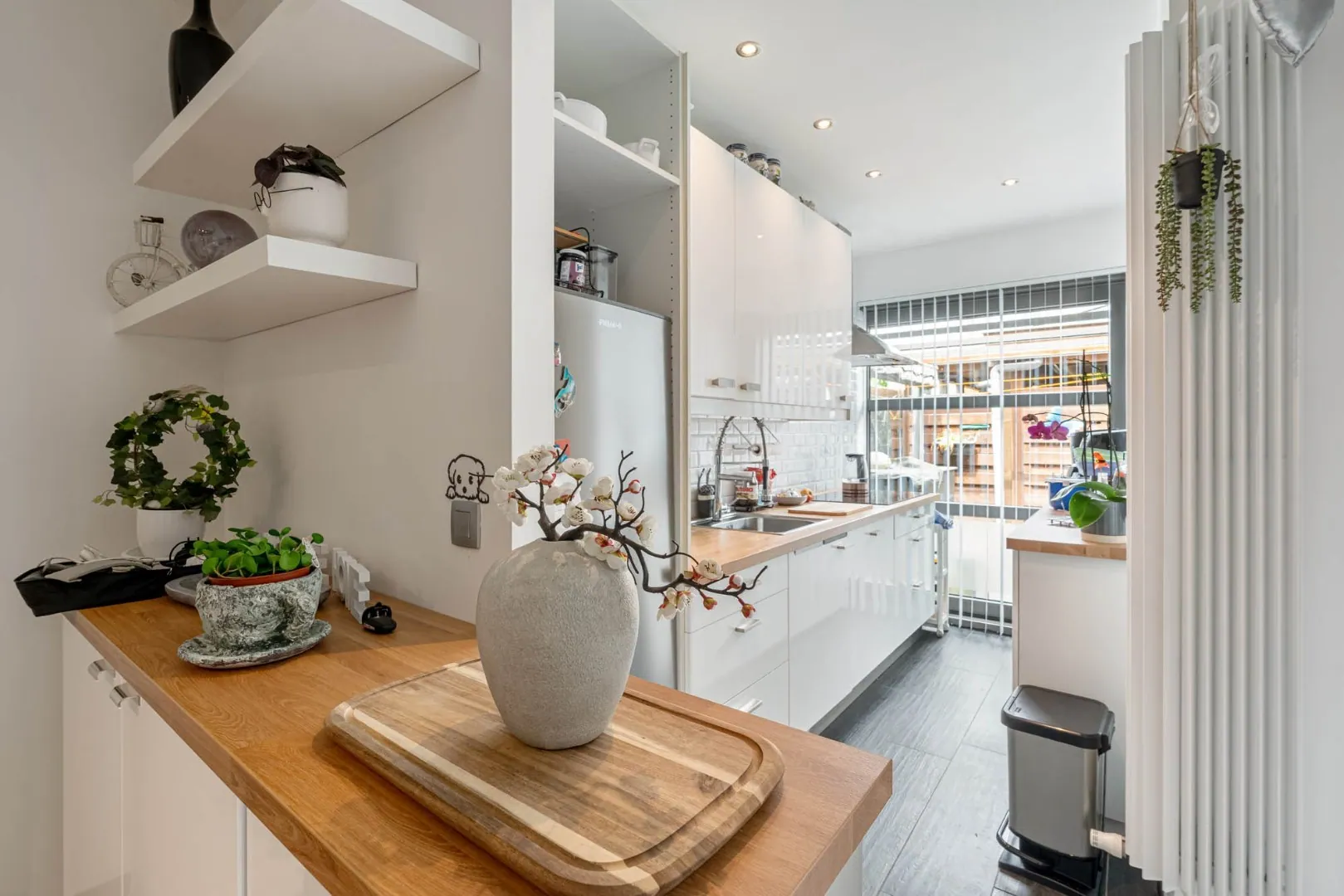 Inkomhal met tegelvloer, een praktische inbouwkast die dienst doet als vestiaire.
