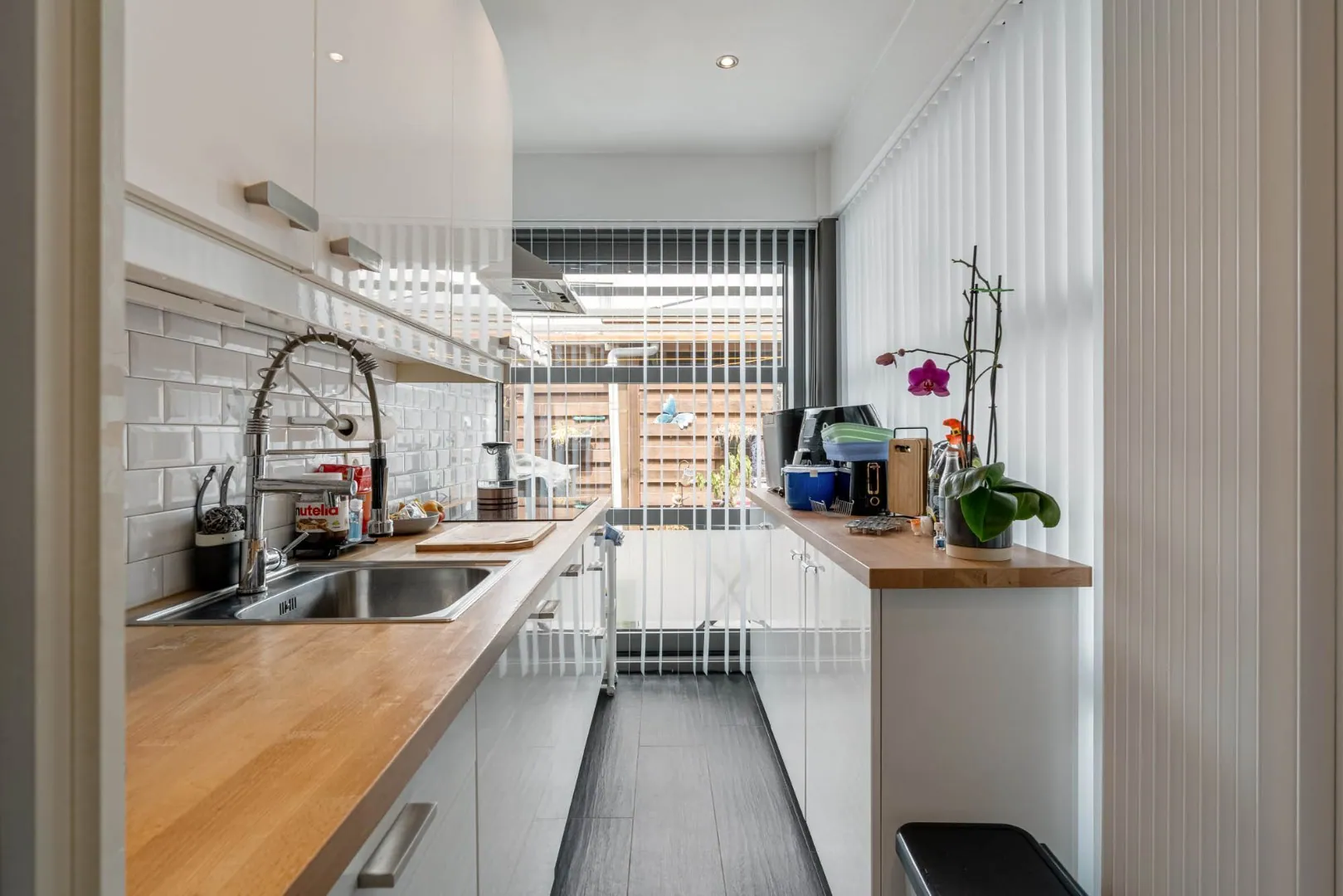 De open keuken is afgewerkt met tegelvloer en voorzien van volgende apparatuur : inductiekookplaat, afzuigkap, gootsteen, vaatwasser.