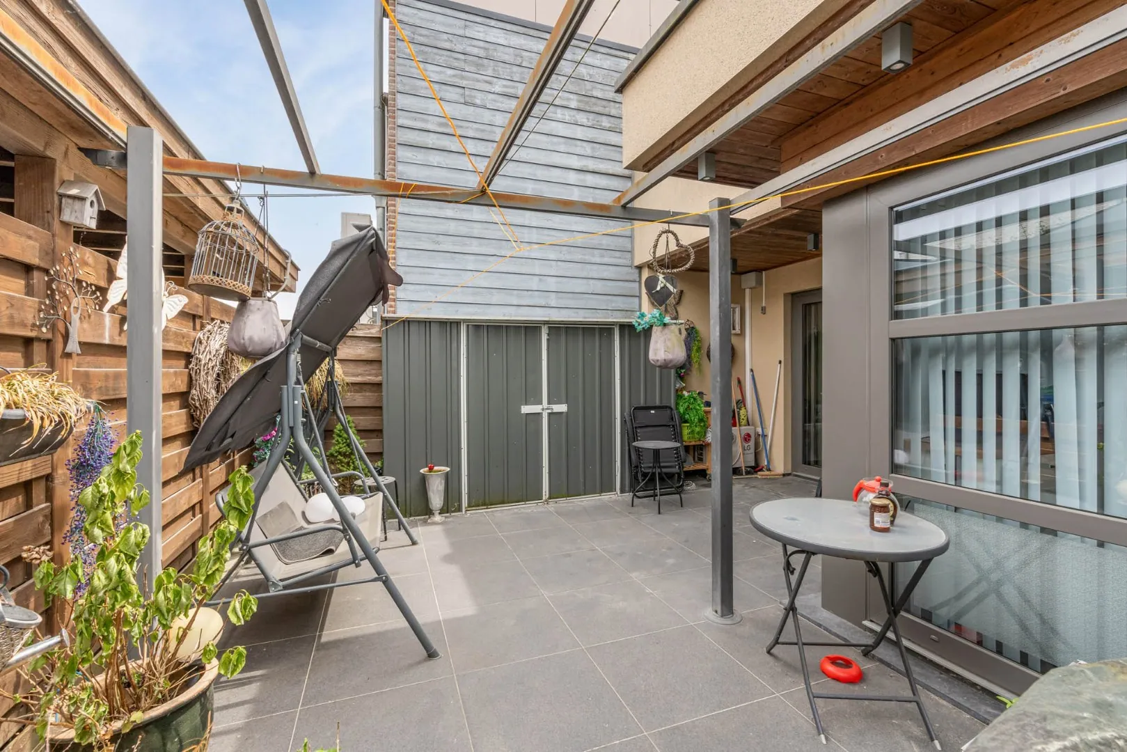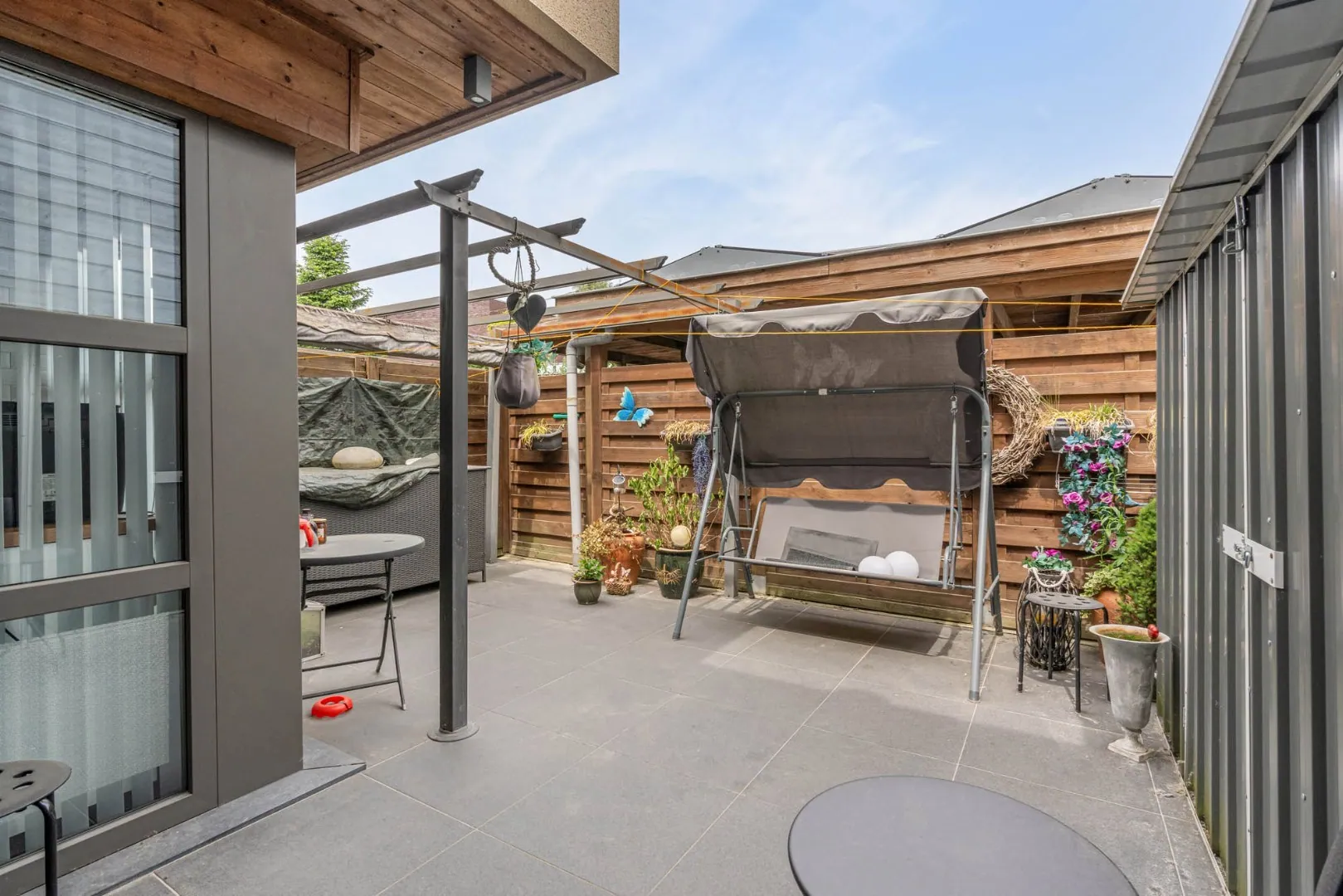 Een schuifraam geeft vanuit de woonkamer toegang tot het ruime terras. Het terras is voorzien van een tegelvloer en biedt voldoende privacy.