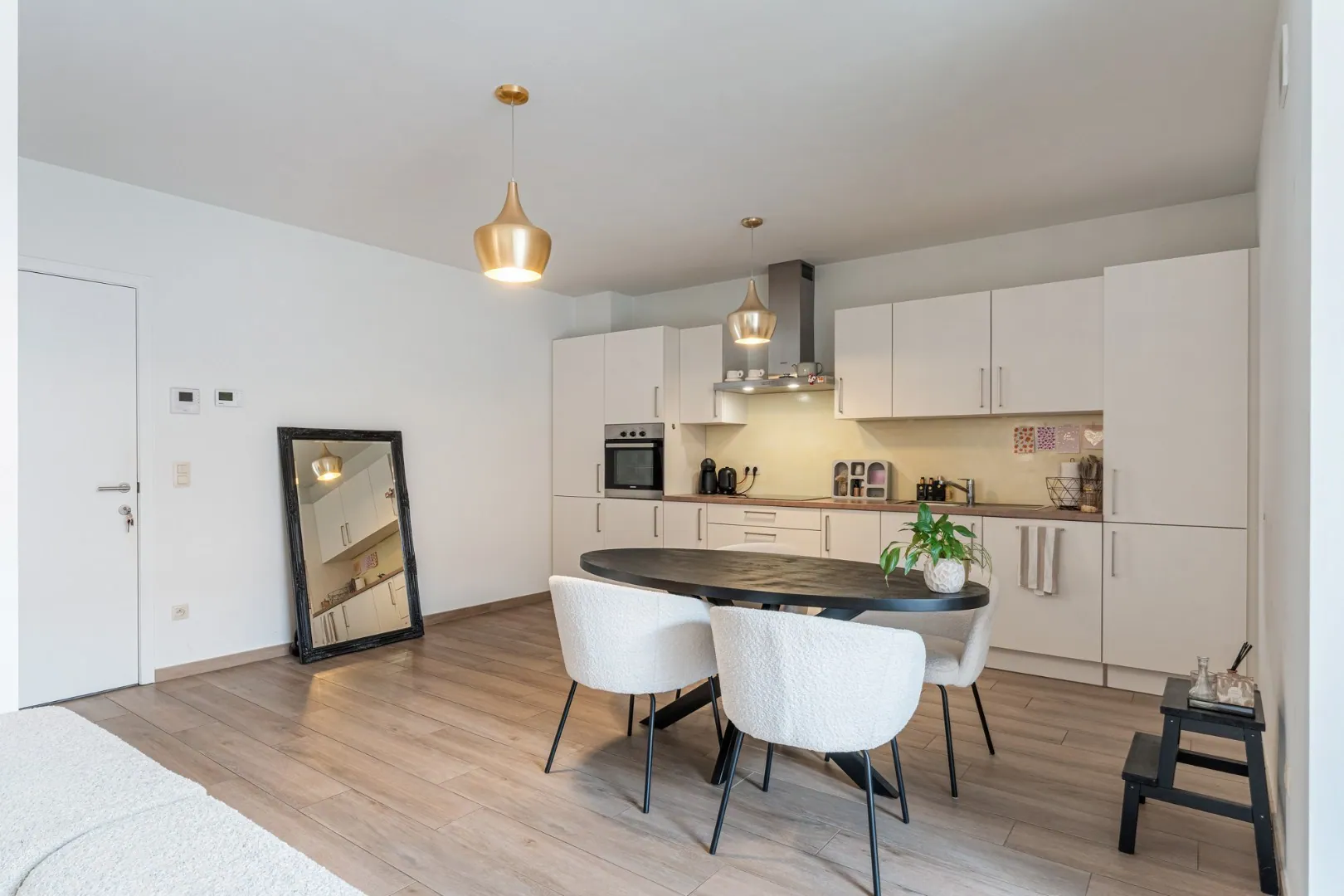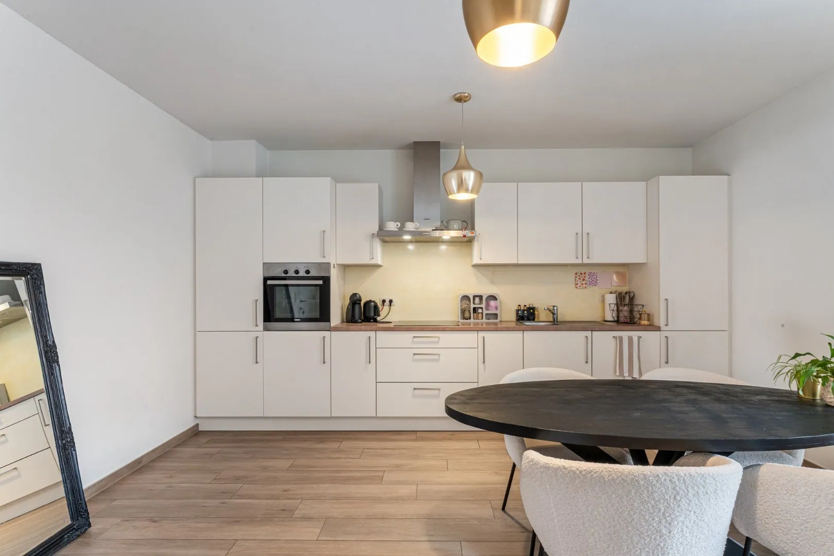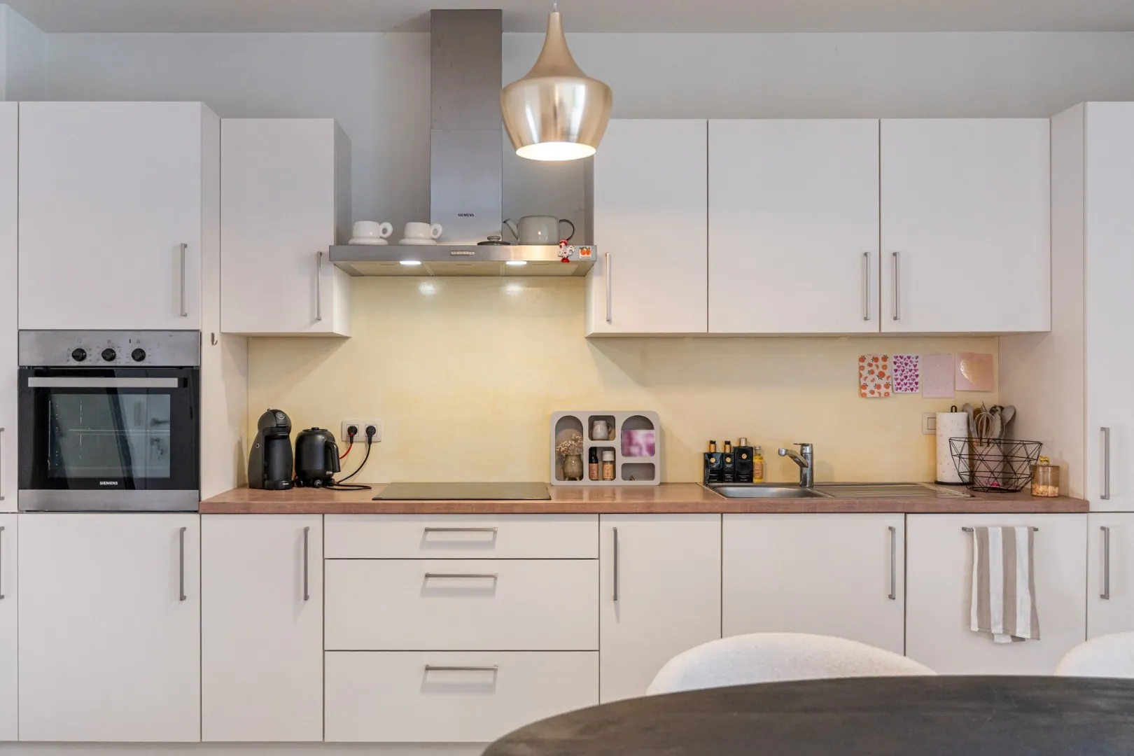 De ruime leefruimte met open keuken waar een schuifraam leidt naar het mooie afgesloten terras, voorzien van tegelvloer. Deze volledig geïnstalleerde keuken is voorzien van een kookplaat, een afzuigkap, een oven, een vaatwasser, een koelkast en spoelbak.