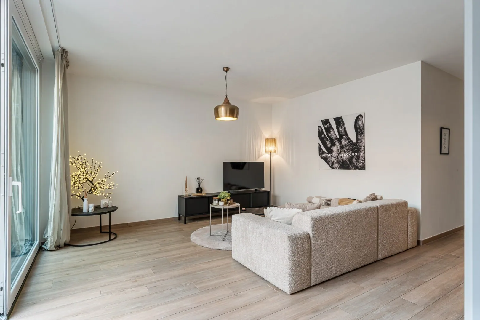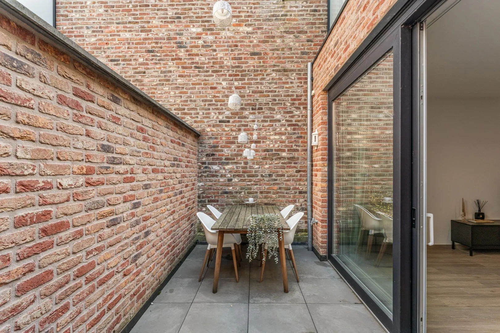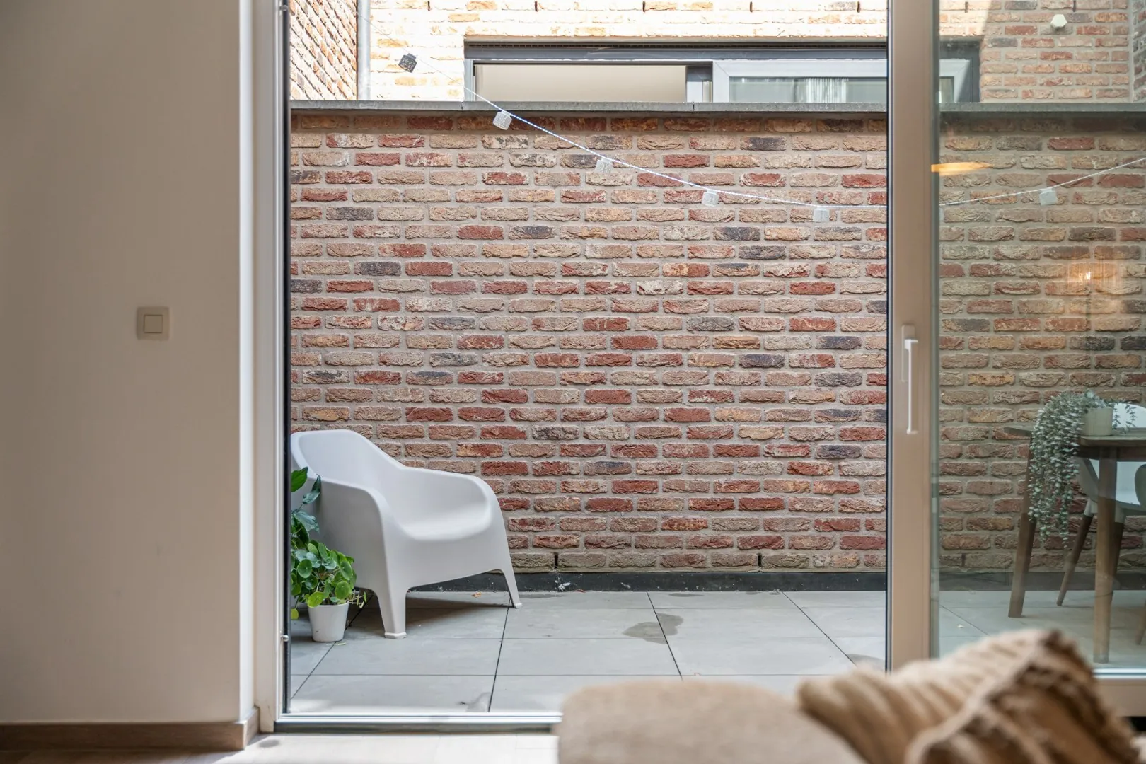 De ruime leefruimte met open keuken waar een schuifraam leidt naar het mooie afgesloten terras, voorzien van tegelvloer. Deze volledig geïnstalleerde keuken is voorzien van een kookplaat, een afzuigkap, een oven, een vaatwasser, een koelkast en spoelbak.