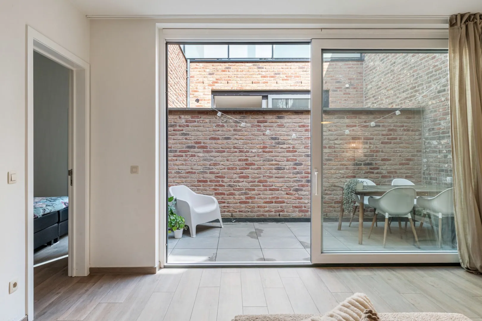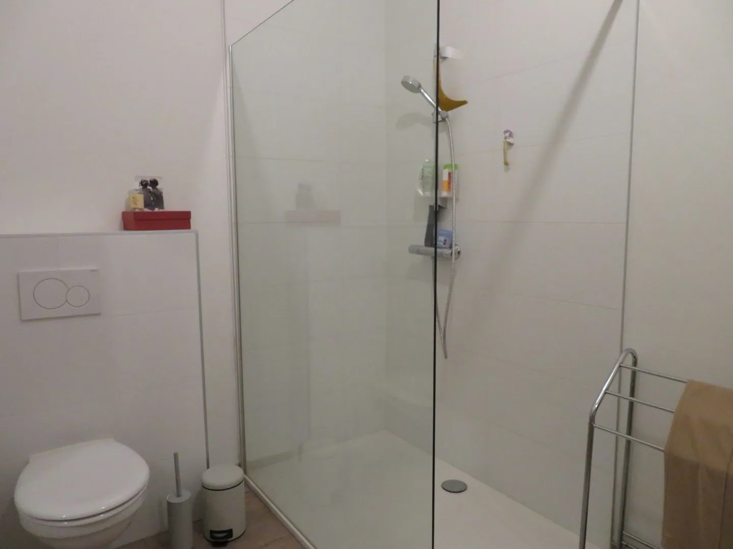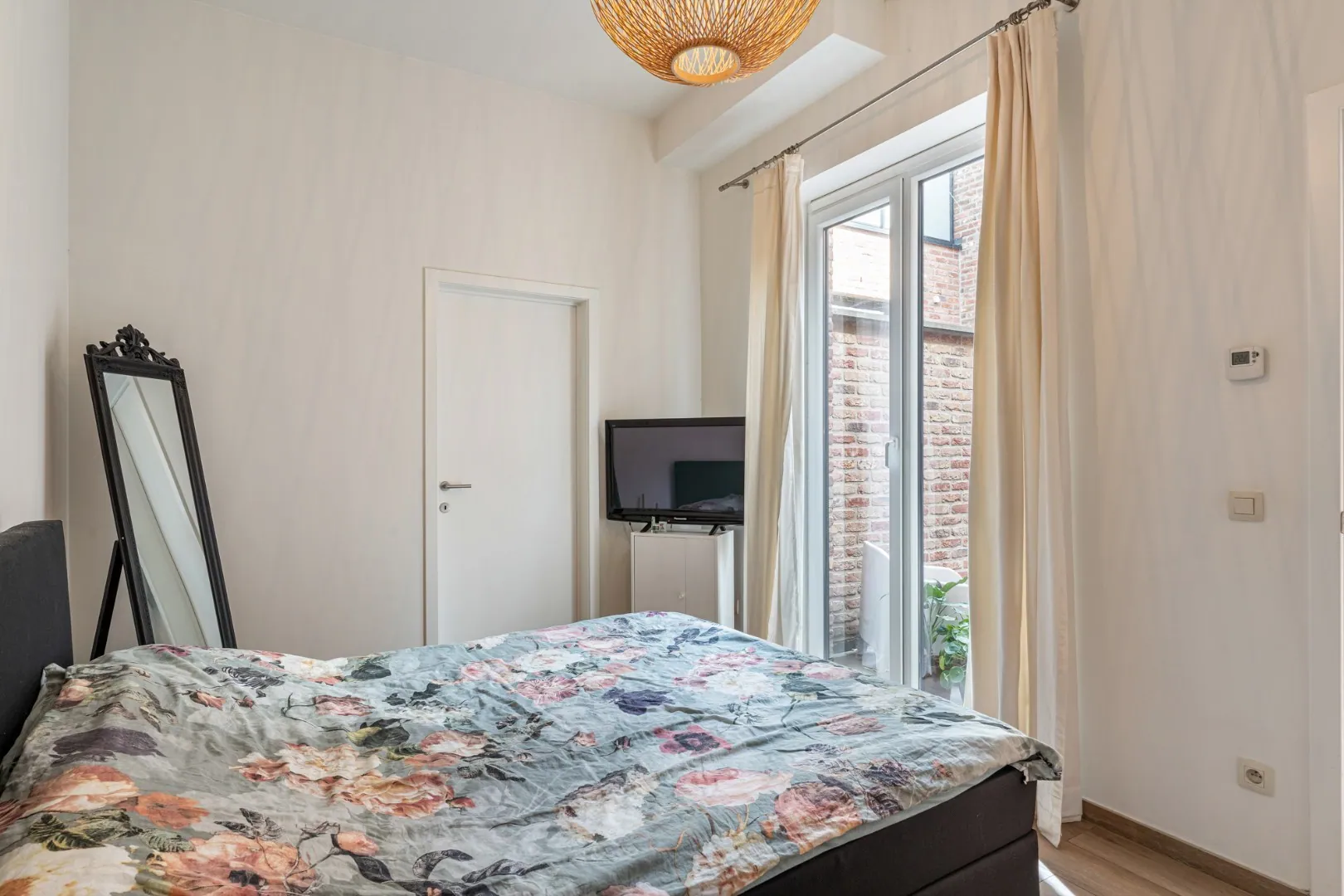Verder is er een slaapkamer, dewelke eveneens toegang geeft tot het terras. Aansluitend een compleet uitgeruste badkamer met inloopdouche, wastafel in badmeubel, toilet en aansluiting voor wasmachine en droogkast.