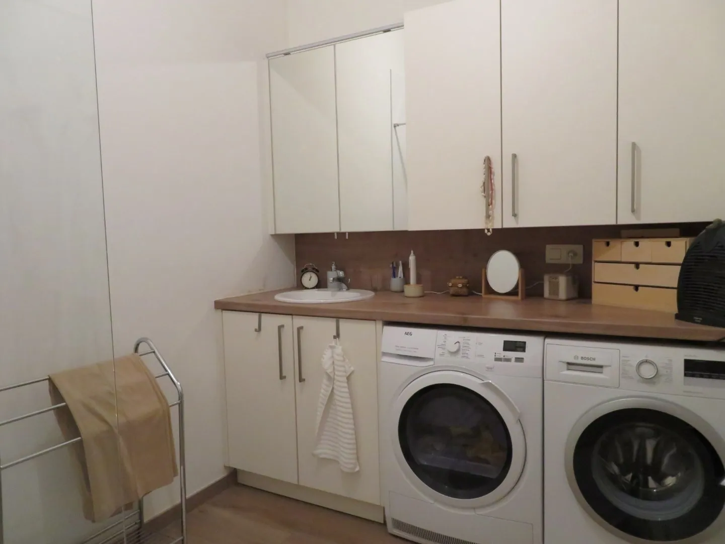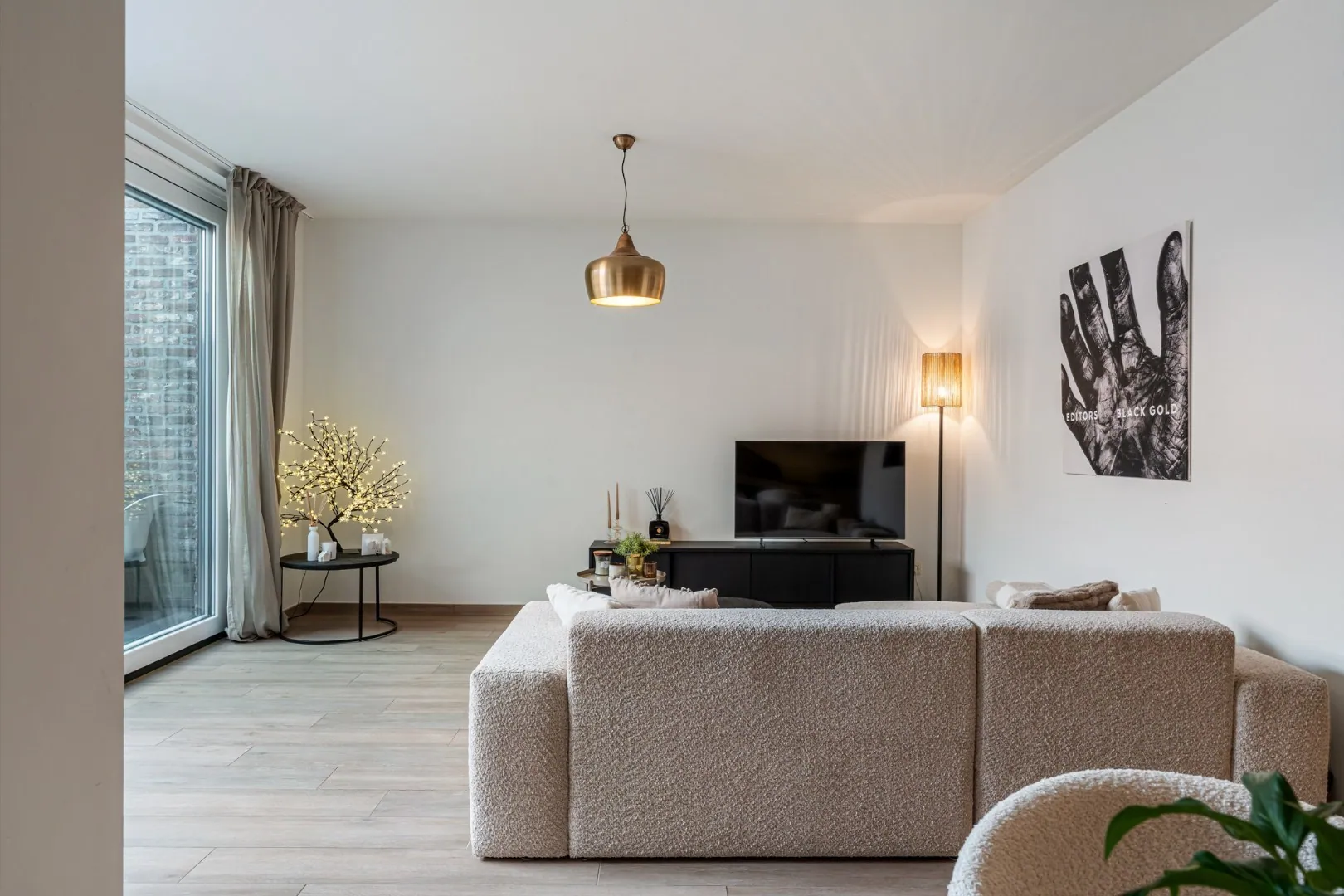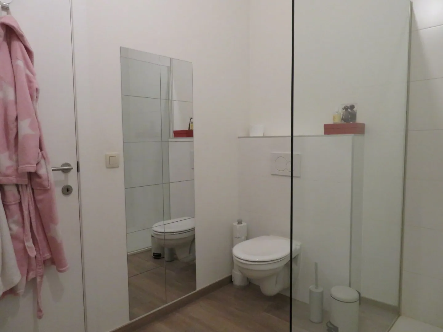 Verder is er een slaapkamer, dewelke eveneens toegang geeft tot het terras. Aansluitend een compleet uitgeruste badkamer met inloopdouche, wastafel in badmeubel, toilet en aansluiting voor wasmachine en droogkast.