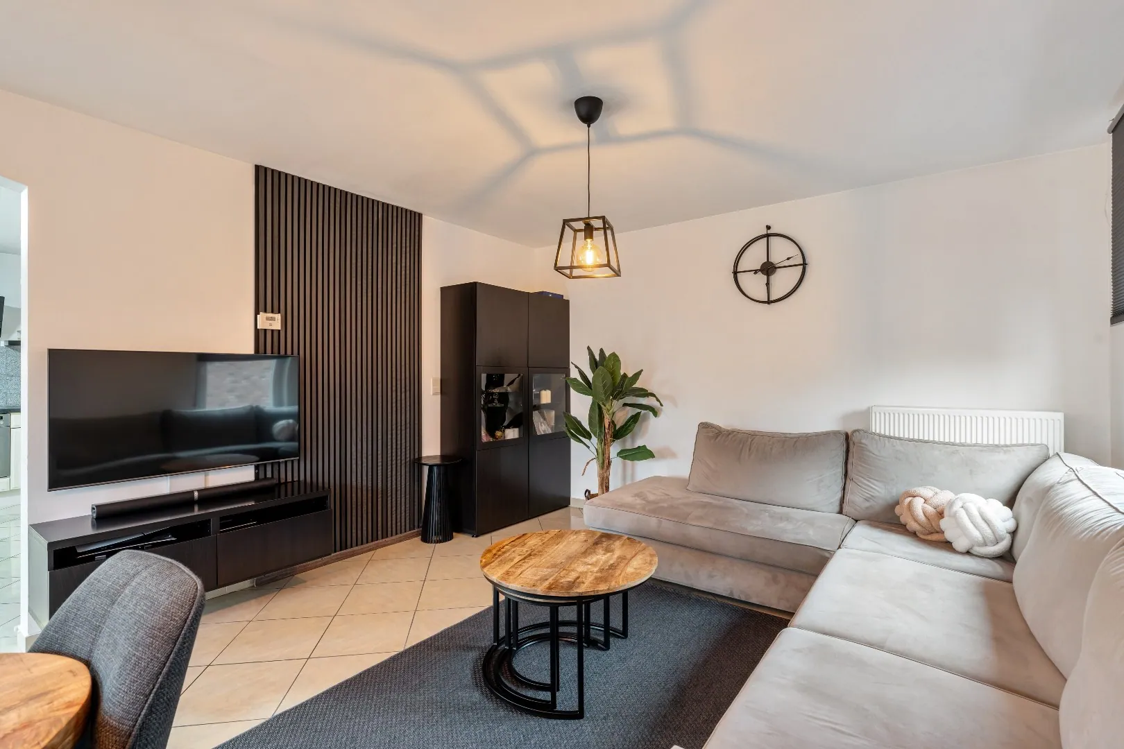De halfopen keuken en leefruimte vormen samen het centrale woonvolume van het appartement, met oog voor comfort en gebruiksgemak. Van hieruit bereikt u een compact terras dat een aangename uitbreiding vormt van het woongedeelte.