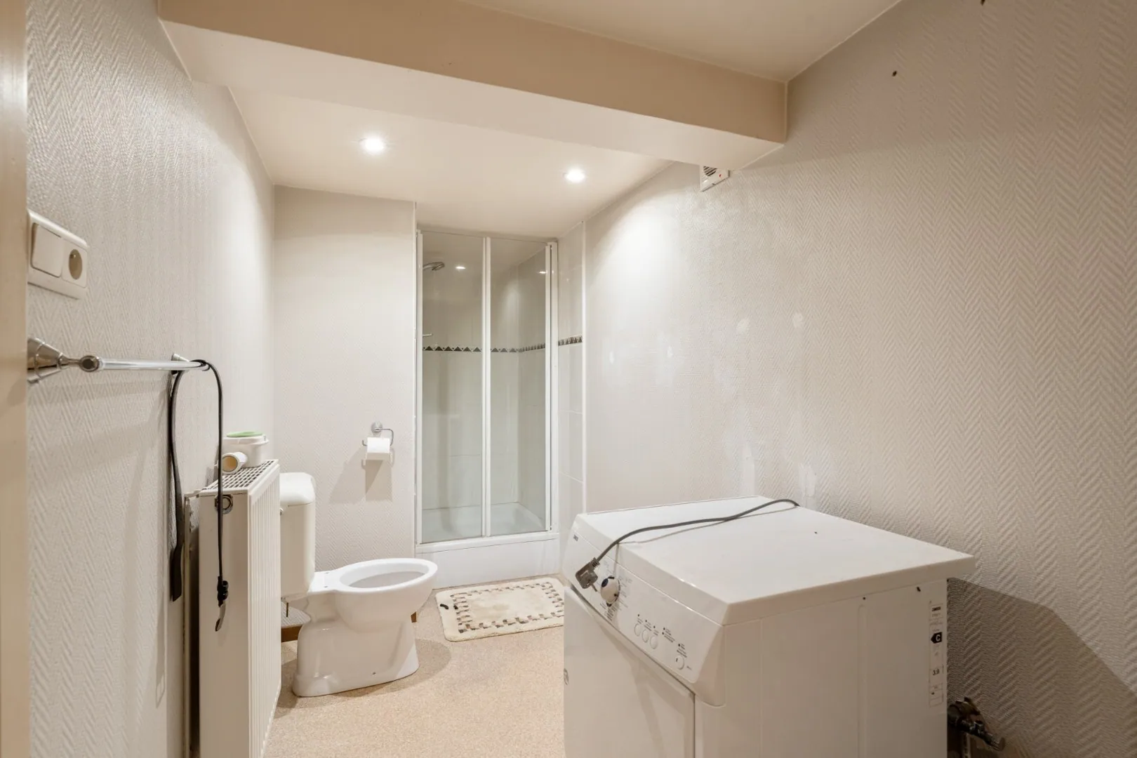 Op de tussenverdieping vinden we een aparte doucheruimte en toilet.