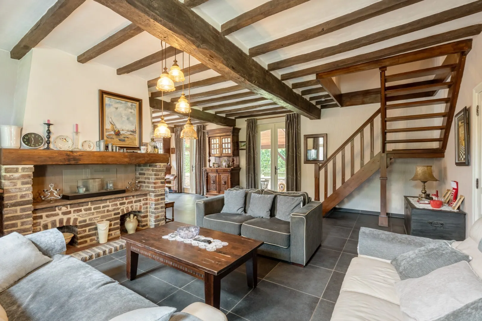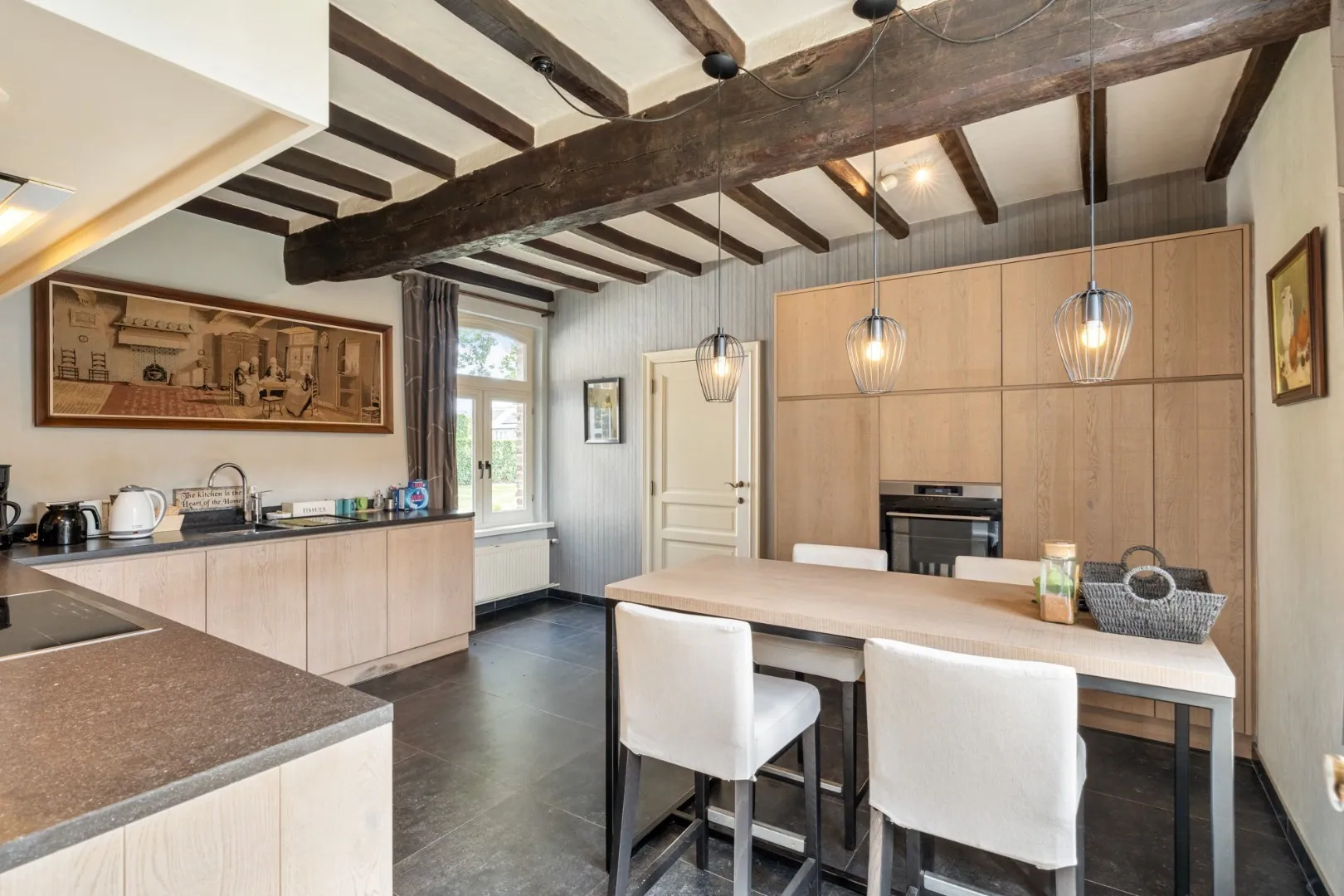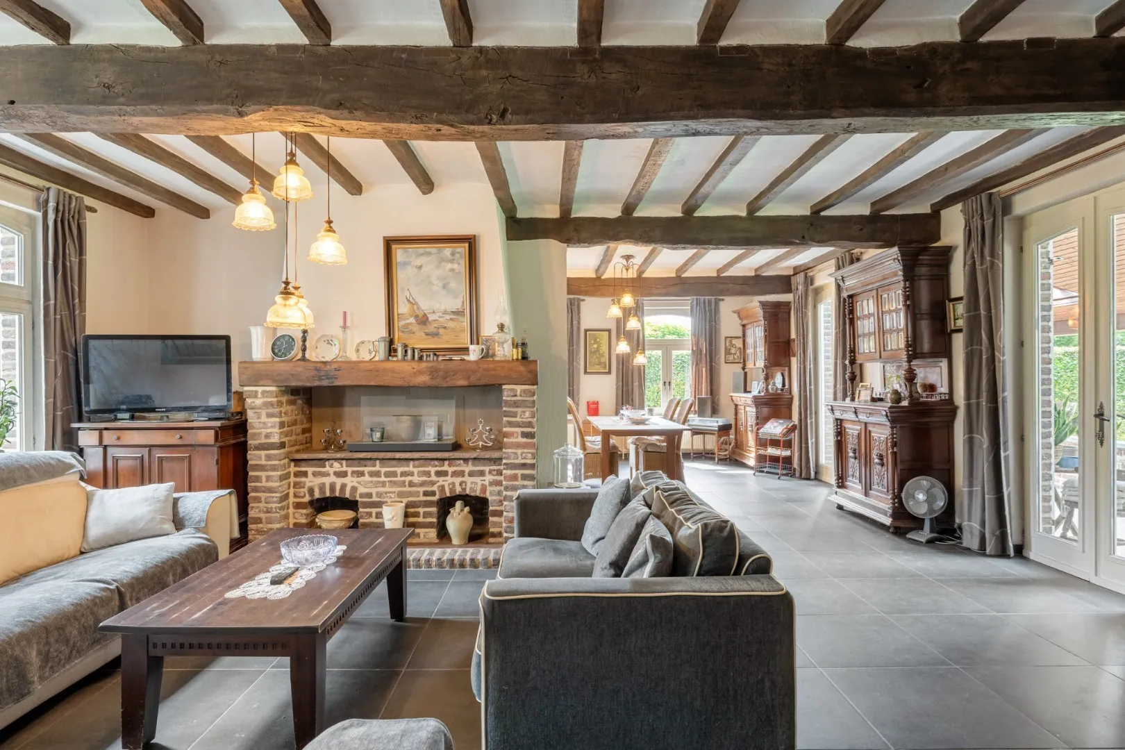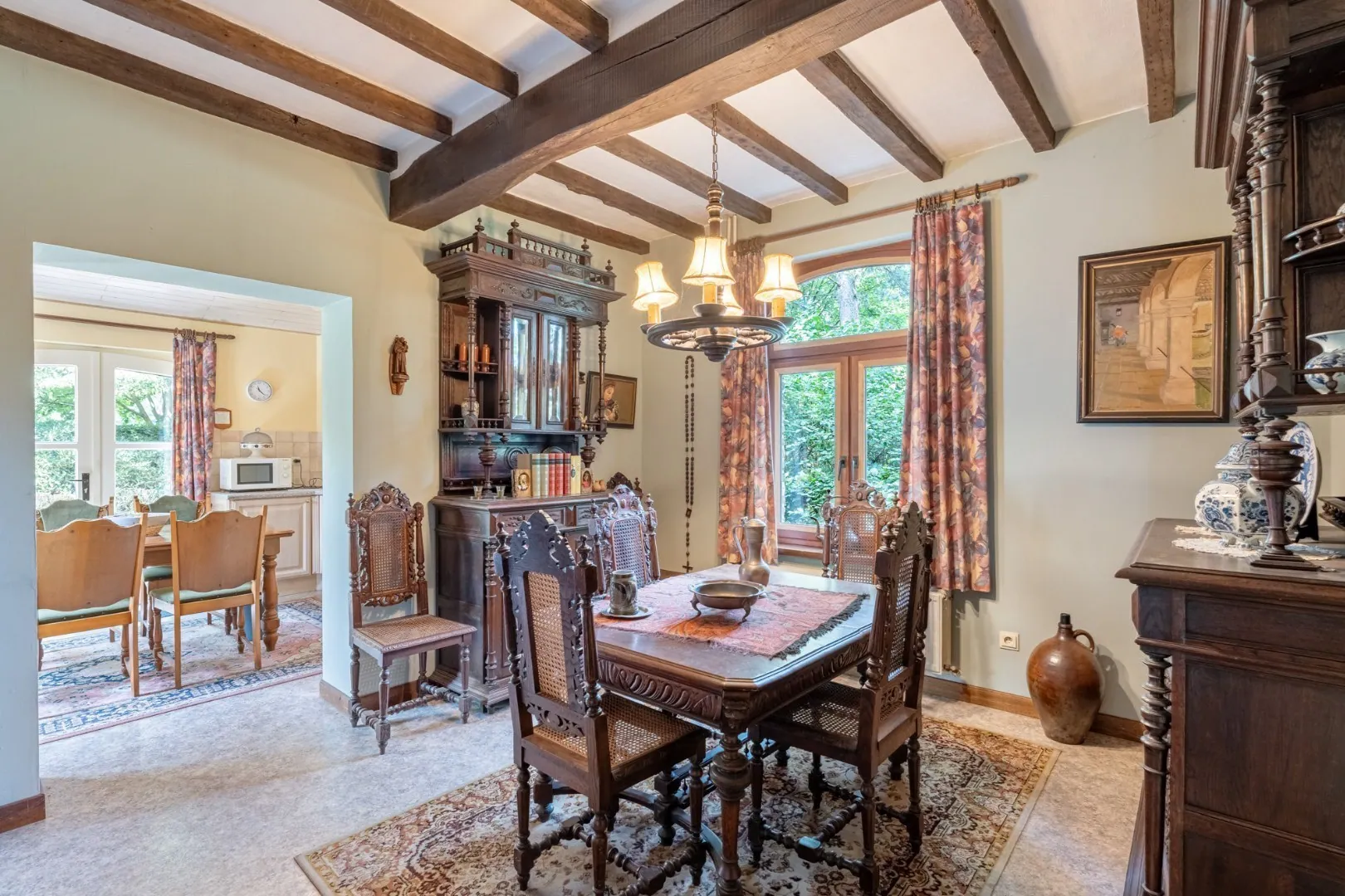 Dit ruime landhuis in een klassieke bouwstijl ademt karakter. De ligging combineert wonen vlakbij de dorpskern met de rust van een parkachtige tuin. De woning werd gebouwd in 1985 met zeer degelijke materialen, de raampartijen tot op vloerniveau in de woonkamer trekken de tuin als het ware naar binnen.