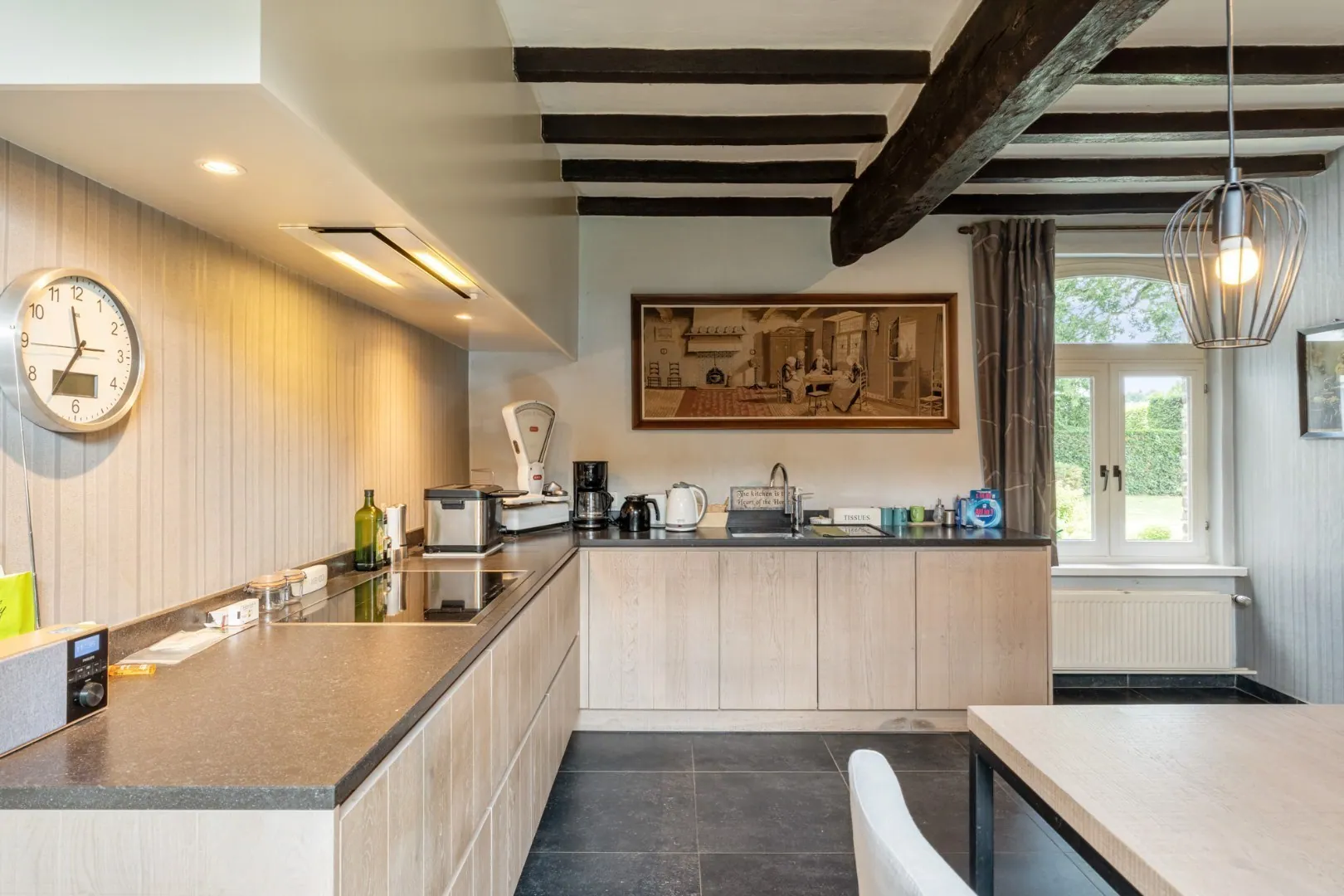 De ruime woonkamer is voorzien van dezelfde tegelvloer, de open haard is een blikvanger in deze woonkamer. De ramen op vloerniveau geven toegang tot het terras en tuin, hetgeen een instant Frans karakter oproept. Aansluitend de ruime, recente eetkeuken, deze is uitgerust met volgende apparatuur: gootsteen, koelkast, oven, inductiekookplaat, afzuigkap, keukenblad in gezoete graniet. Achterinkom met toegang tot garage, voorzien van een tegelvloer, uitgietbak, aansluiting wasmachine. Verder bevinden zich op het gelijkvloers 3 ruime slaapkamers en een inpandige garage voorzien van een tegelvloer.