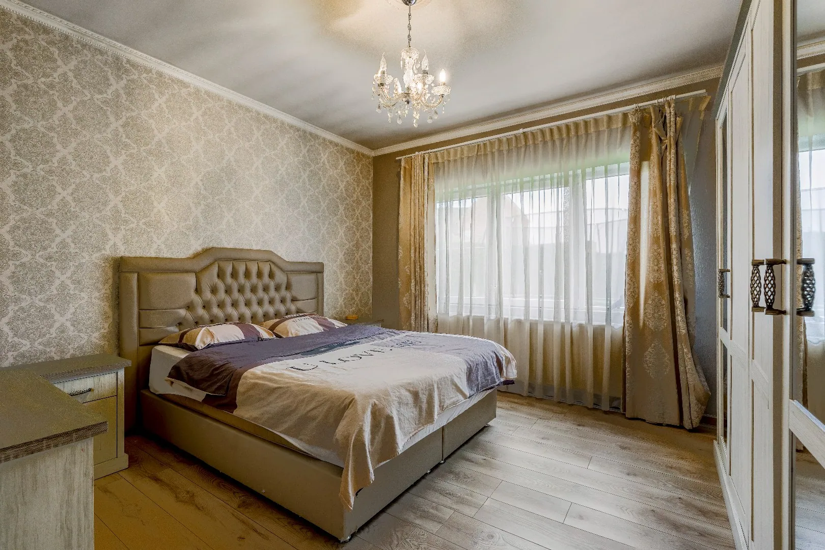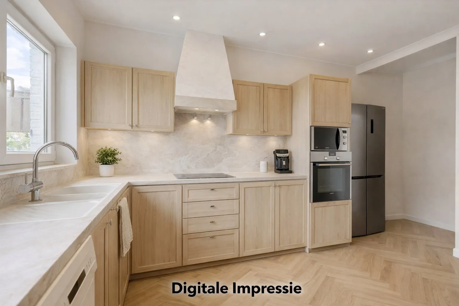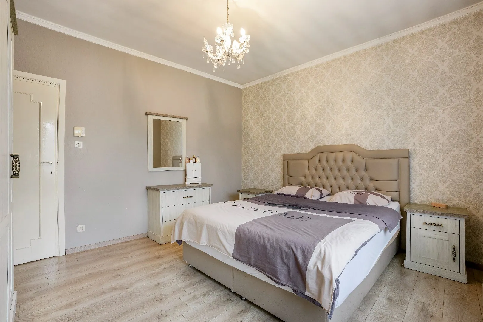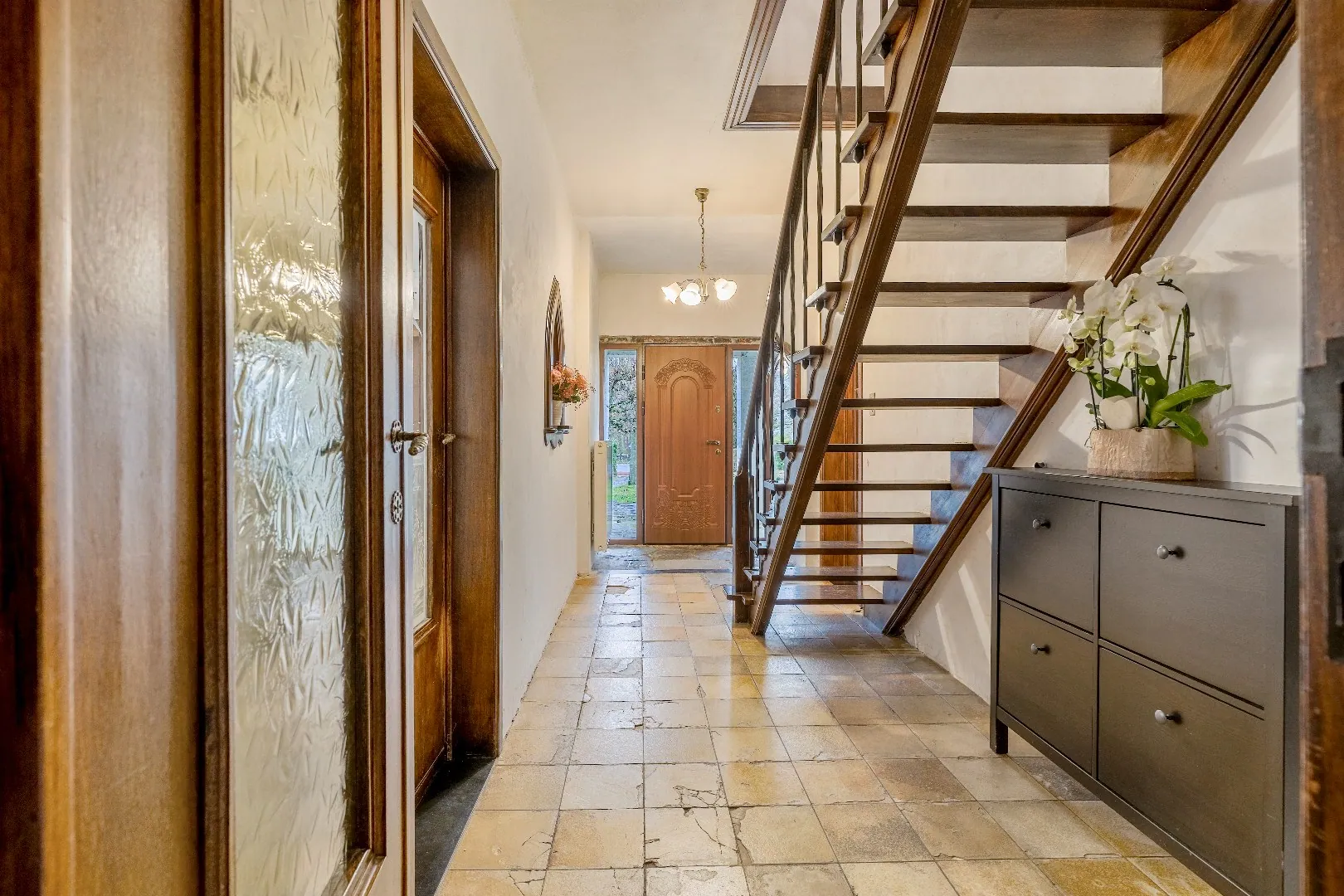 Op het gelijkvloers bevinden zich een leefruimte, keuken, drie slaapkamers en een volledig vernieuwde badkamer met marmeraccenten.