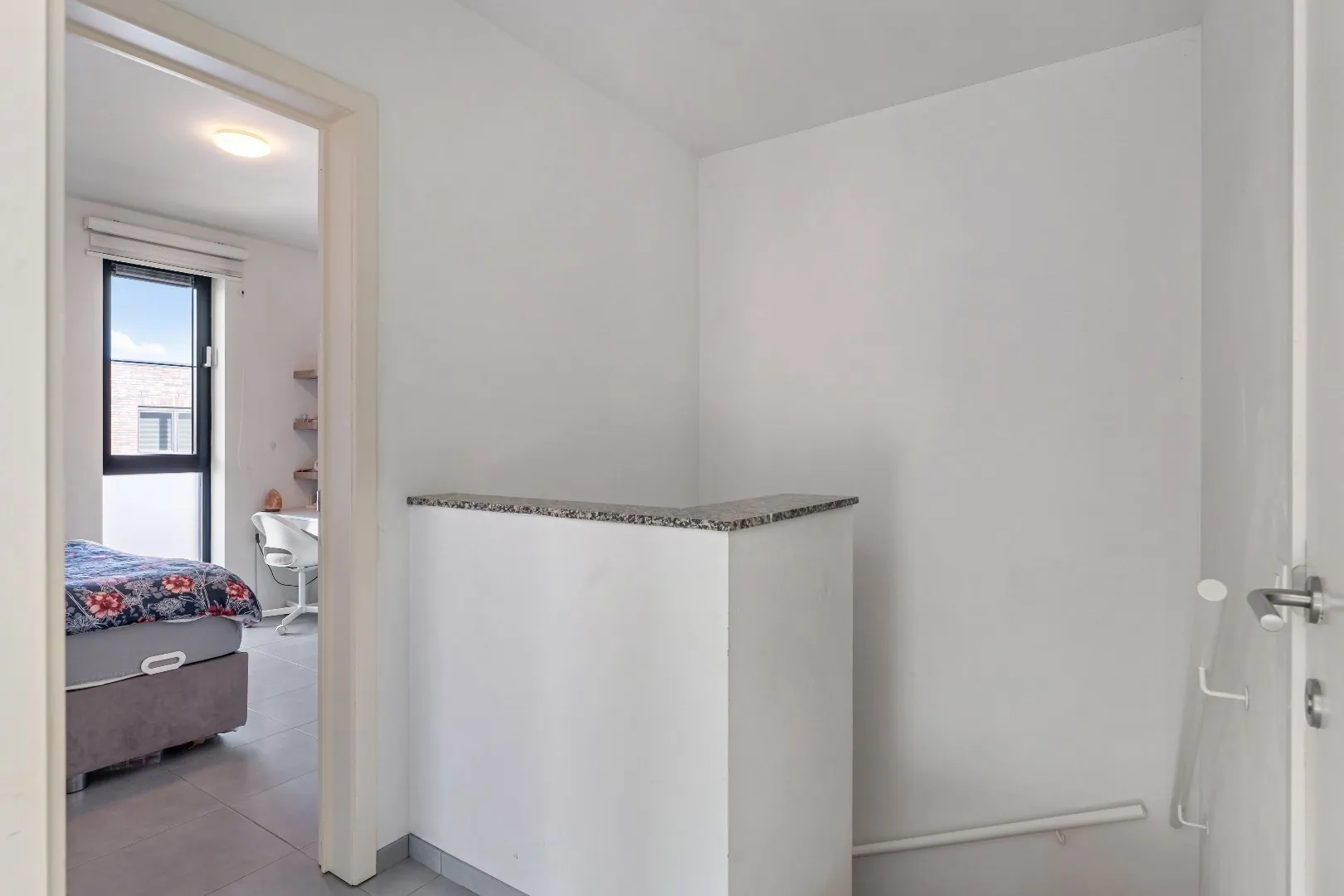 De overloop op het verdiep verleent toegang tot de drie slaapkamers met functionele maatkasten en een ingerichte badkamer, uitgerust met een badkamermeubel met dubbele wastafel, spiegelkast en douche.