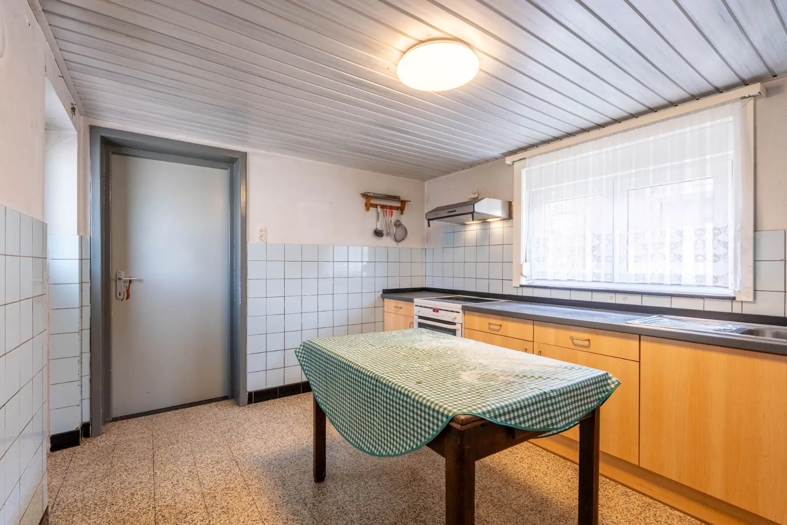 Via de voordeur komen we in de karakteristieke inkomhal. Deze inkomhal leidt naar een zitkamer en naar de living. Aansluitend aan de zitkamer is er een keuken met een oven, een kookplaat, een afzuigkap en een dubbele spoelbak. Tenslotte is er een badkamer met ligbad en lavabo.