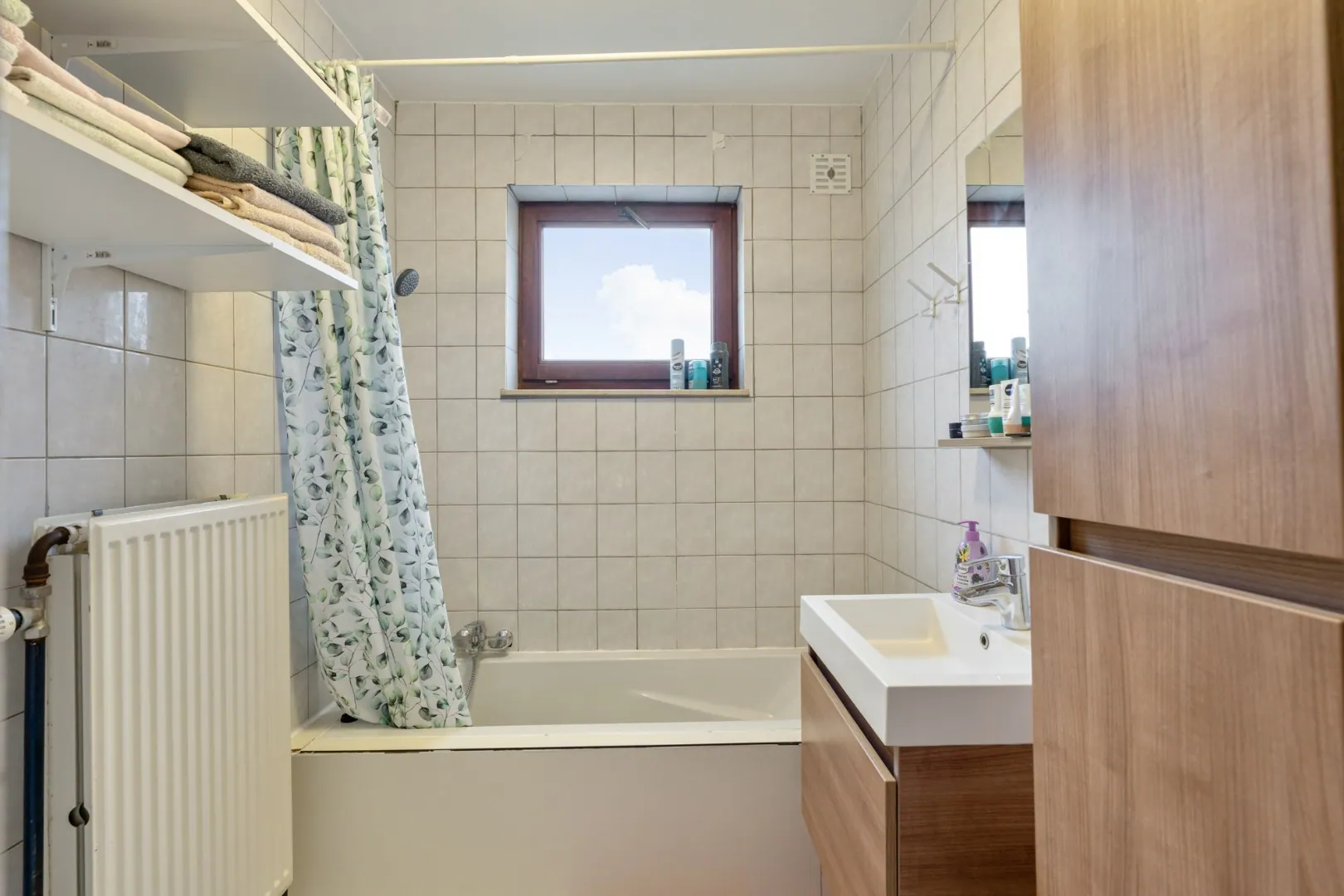 De badkamer is afgewerkt met tegelvloer en voorziet een ligbad met douchemogelijkheid, een wastafel en een toilet.