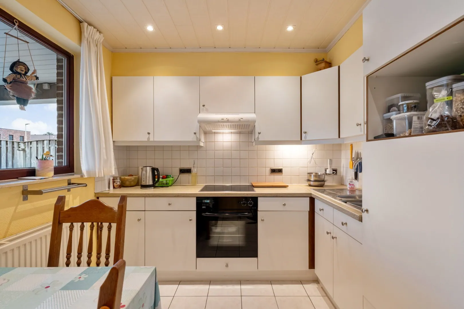De gesloten keuken biedt voldoende ruimte om te zorgen voor een bijkomende 'eet - en leefruimte' . De keuken is eveneens voorzien van tegelvloer, verzorgde keukenkasten en apparatuur : kookplaat, afzuigkap, oven, gootsteen, koelkast.