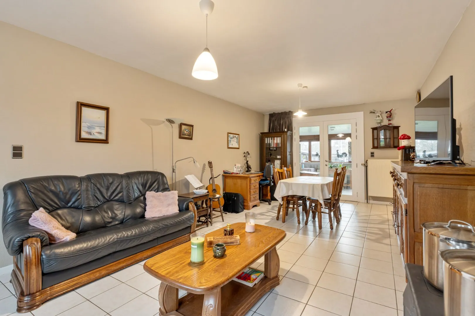 Aansluitend de gezellige woonkamer, eveneens voorzien van een tegelvloer. De houthaard zorgt hier voor de nodige gezelligheid.