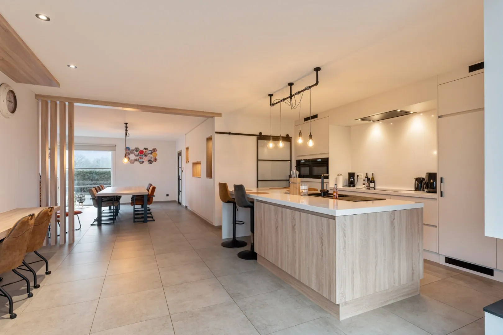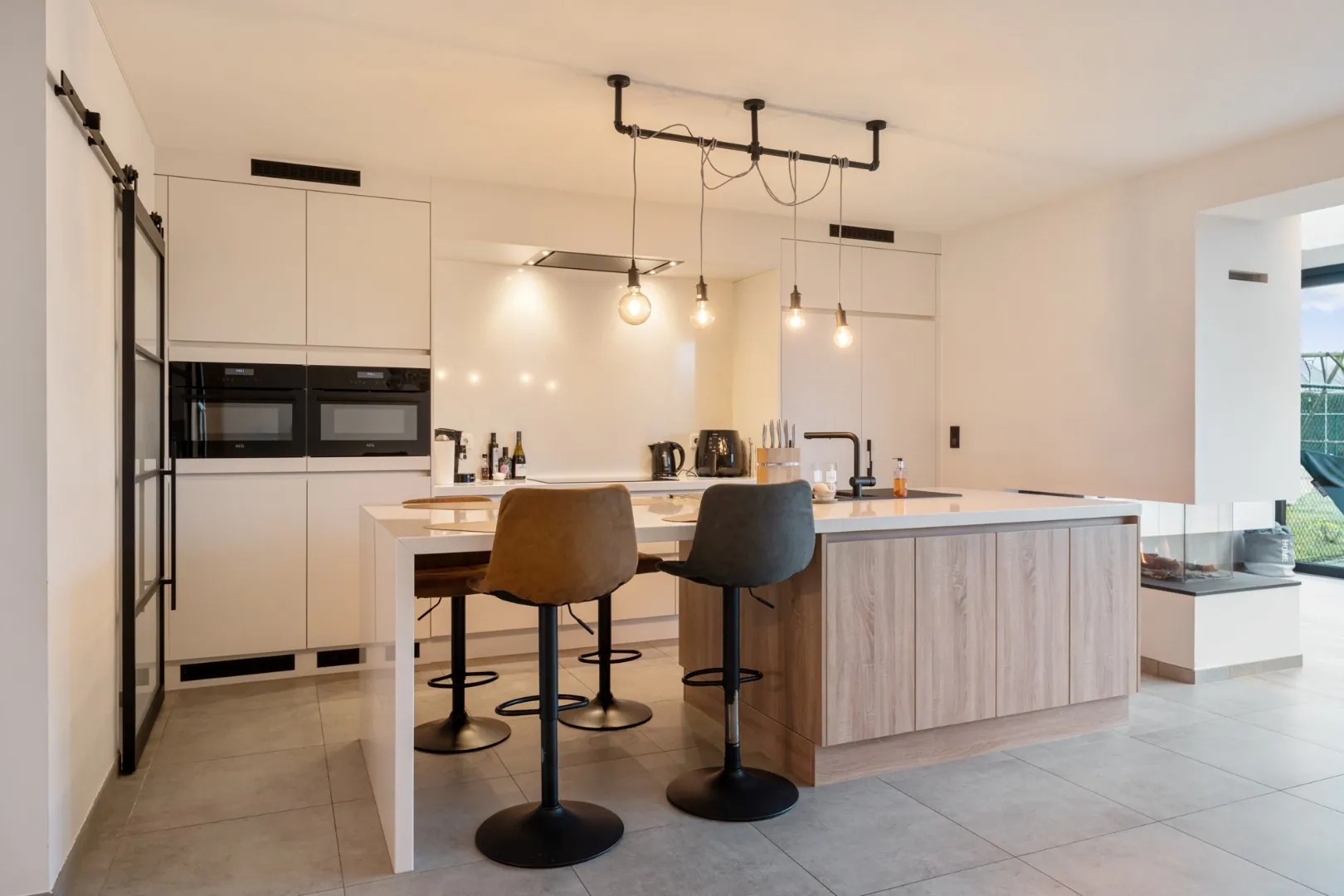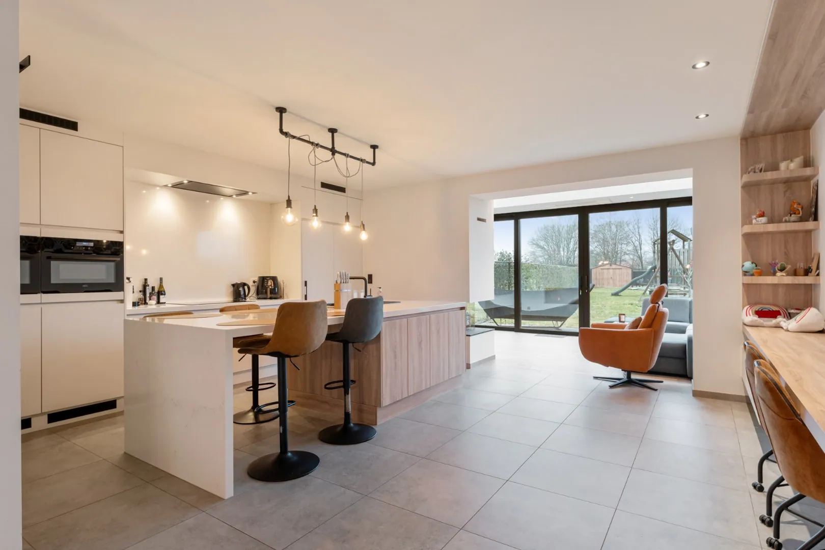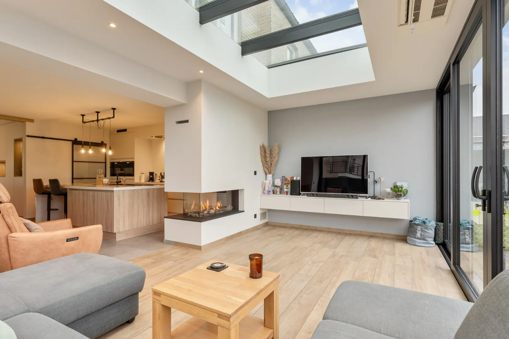 Via de voordeur komen we in de inkomhal. Hier bevindt zich meteen het gastentoilet. Via een glazen deur komen we in de riante leefruimte. Deze leefruimte bestaat aan de voorzijde van het huis uit een eetgedeelte. Aansluitend is er een volledig ingerichte, kwalitatieve keuken. Deze maatwerkkeuken is voorzien van een eiland met ontbijttoog en een achterwand met plafondhoge kolomkasten. Volgende apparatuur is voorzien: inductie kookplaat met afzuiging, vaatwasser (SIEMENS), 2 combi-ovens (AEG), een ruime koelkast (AEG) en een spoelbak. Een doorkijk-gashaard verbindt deze leefkeuken met de prachtige zitkamer aan de achterzijde van de woning. Deze zitkamer heeft dankzij de grote raampartijen veel lichtinval en een fraai tuincontact! De volledige leefruimte is voorzien van inbouwkasten in dezelfde stijl.