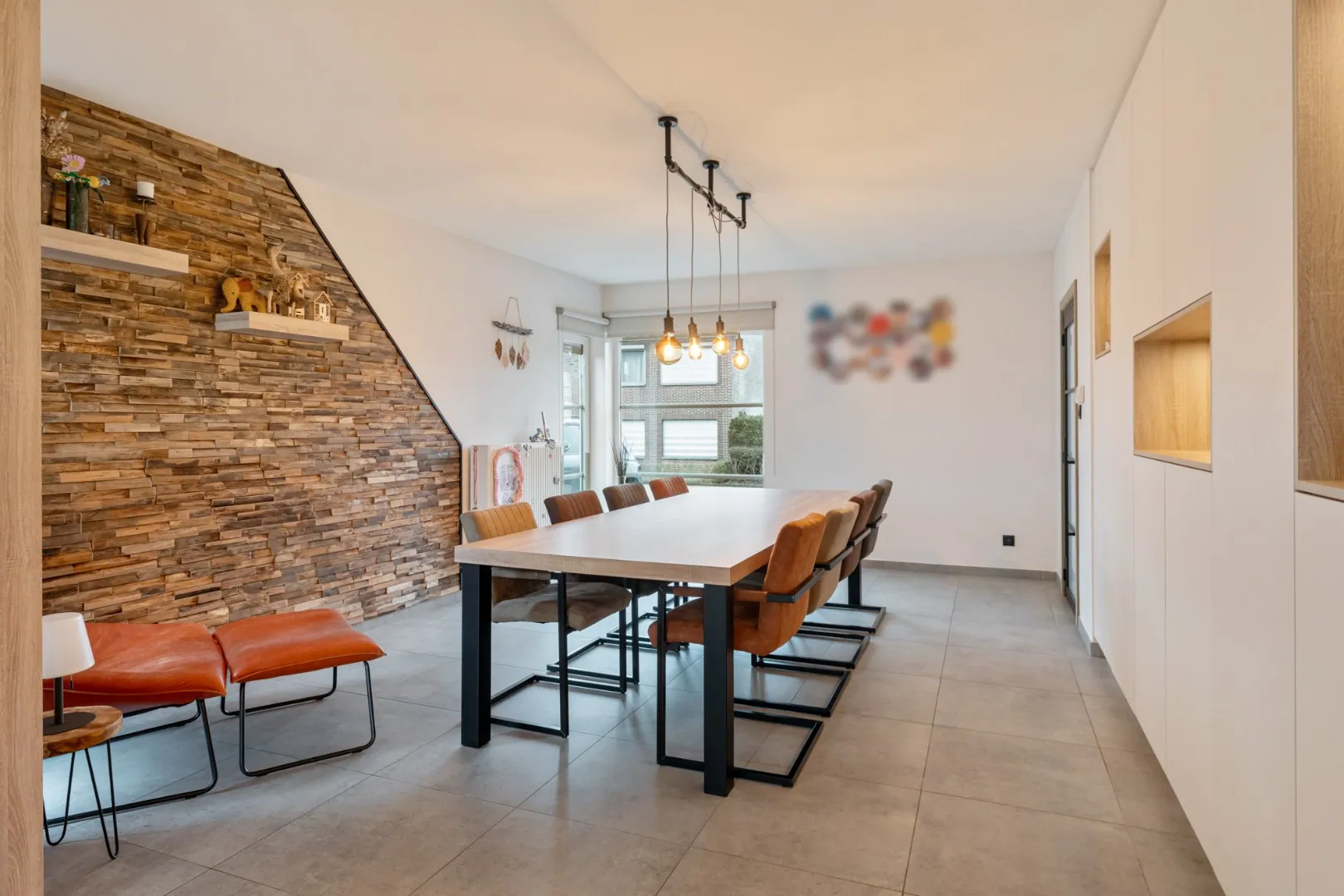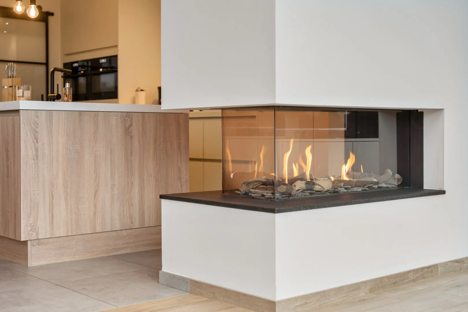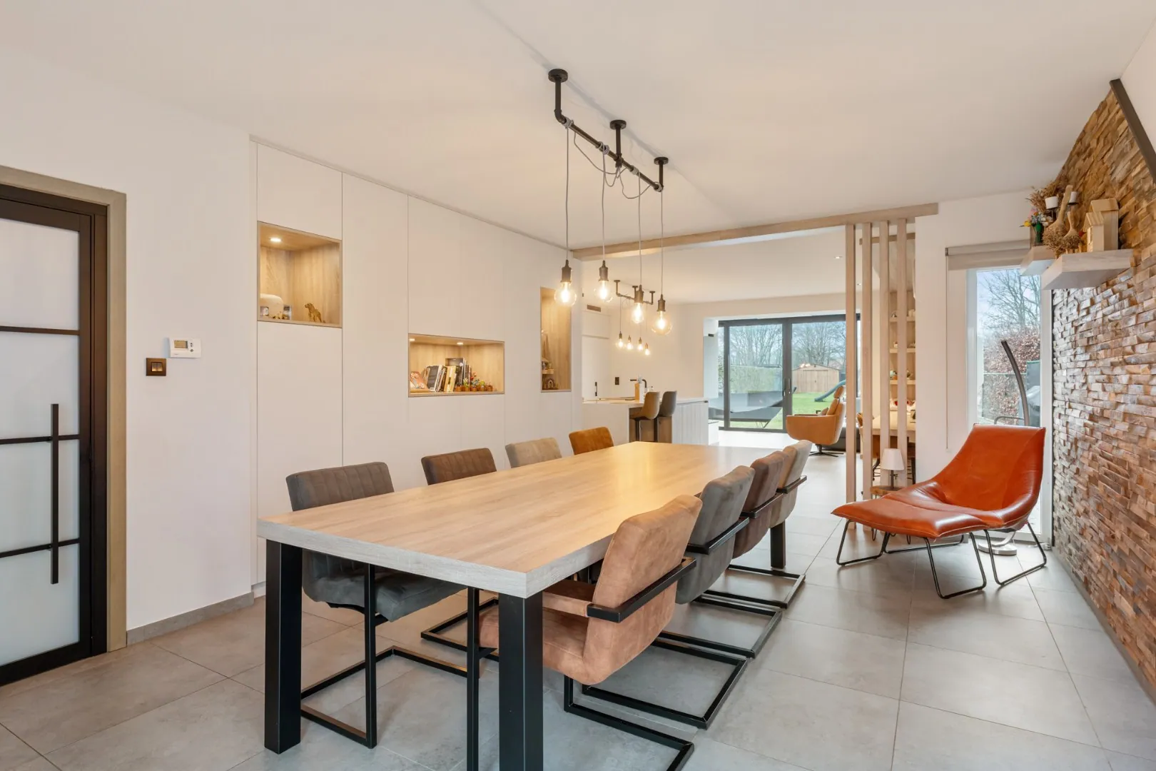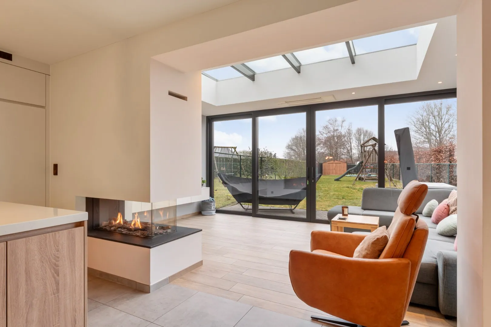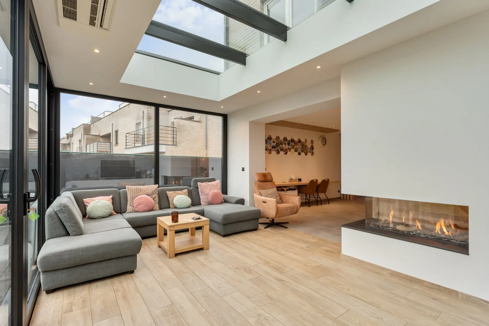 Via de voordeur komen we in de inkomhal. Hier bevindt zich meteen het gastentoilet. Via een glazen deur komen we in de riante leefruimte. Deze leefruimte bestaat aan de voorzijde van het huis uit een eetgedeelte. Aansluitend is er een volledig ingerichte, kwalitatieve keuken. Deze maatwerkkeuken is voorzien van een eiland met ontbijttoog en een achterwand met plafondhoge kolomkasten. Volgende apparatuur is voorzien: inductie kookplaat met afzuiging, vaatwasser (SIEMENS), 2 combi-ovens (AEG), een ruime koelkast (AEG) en een spoelbak. Een doorkijk-gashaard verbindt deze leefkeuken met de prachtige zitkamer aan de achterzijde van de woning. Deze zitkamer heeft dankzij de grote raampartijen veel lichtinval en een fraai tuincontact! De volledige leefruimte is voorzien van inbouwkasten in dezelfde stijl.