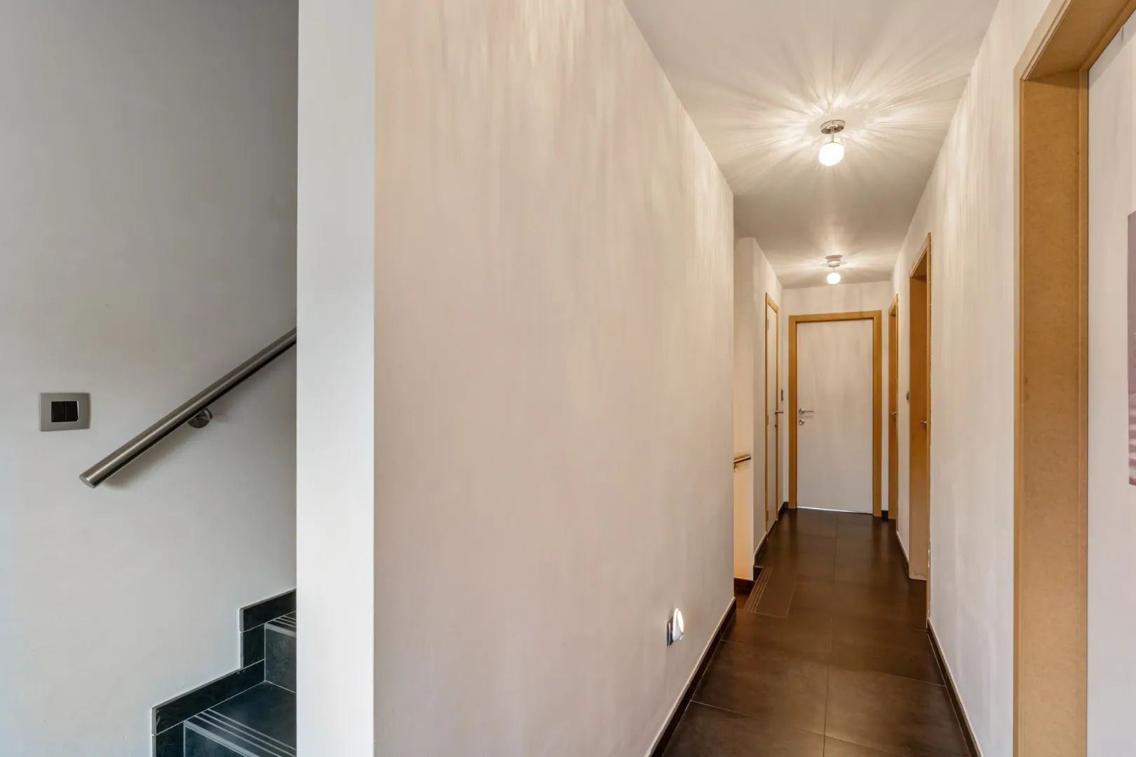 Via de trap in de inkomhal komen we op de nachthal op de 1ste verdieping. Deze nachthal leidt enerzijds naar de badkamer, uitgerust met een bad/douchecombinatie, een badmeubel met wastafel en een 2de toilet. Anderzijds naar 2 ruime slaapkamers. Tenslotte bevindt er zich op deze verdieping een handige berging en een ruimte voor het wasmachine en de droogkast.