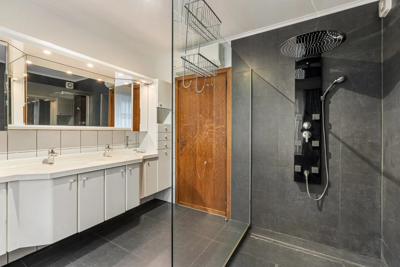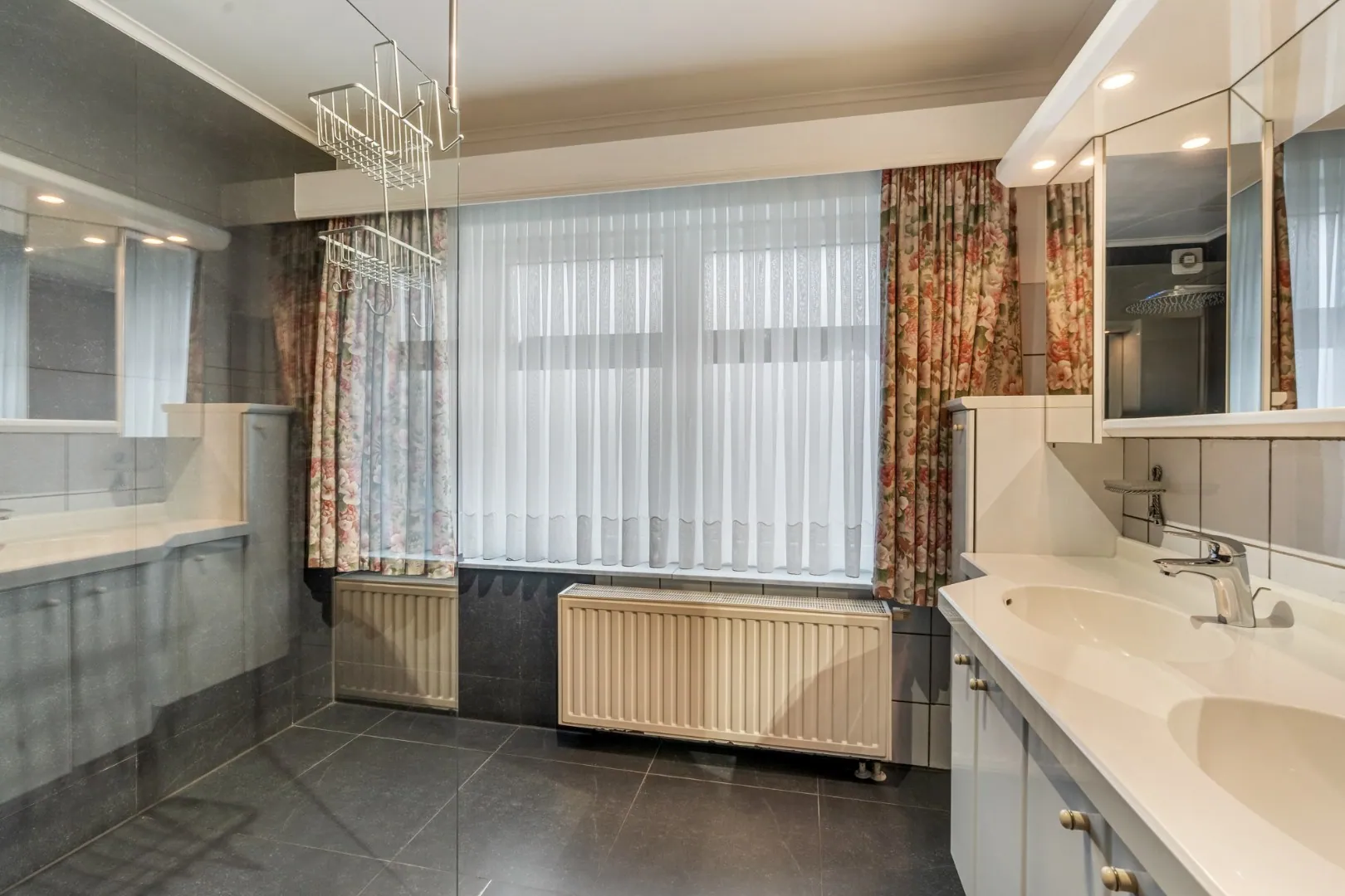 De recent vernieuwde badkamer voorziet een ruime inloopdouche met diverse sproeikoppen, een badmeubel met dubbele wastafel.