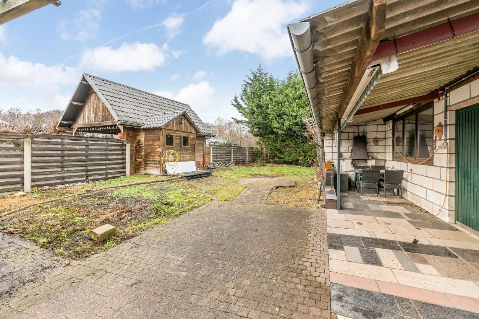 De tuin is volledig omheind en voorzien van verharding, grasperk en een ruime, gemetselde tuinberging.