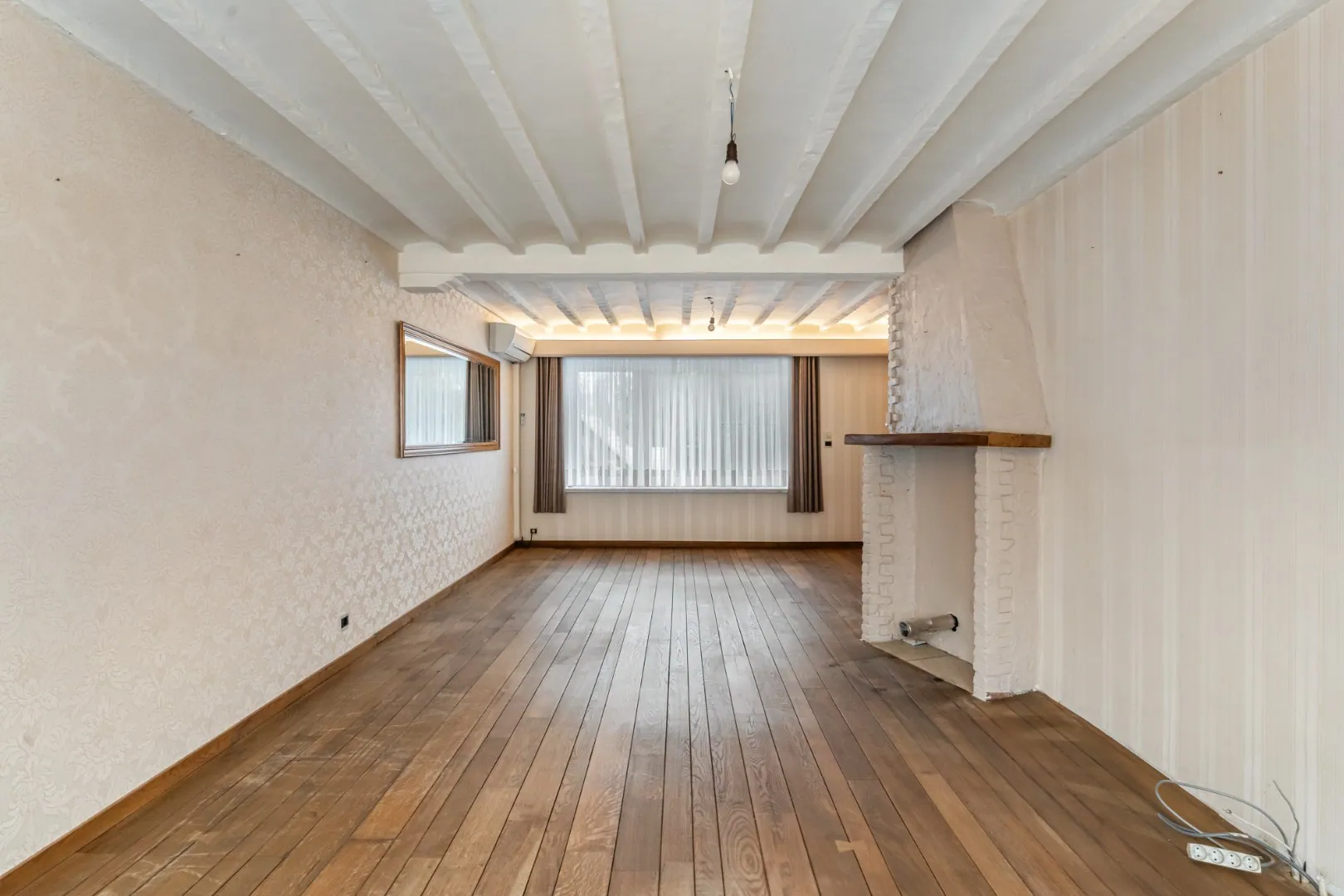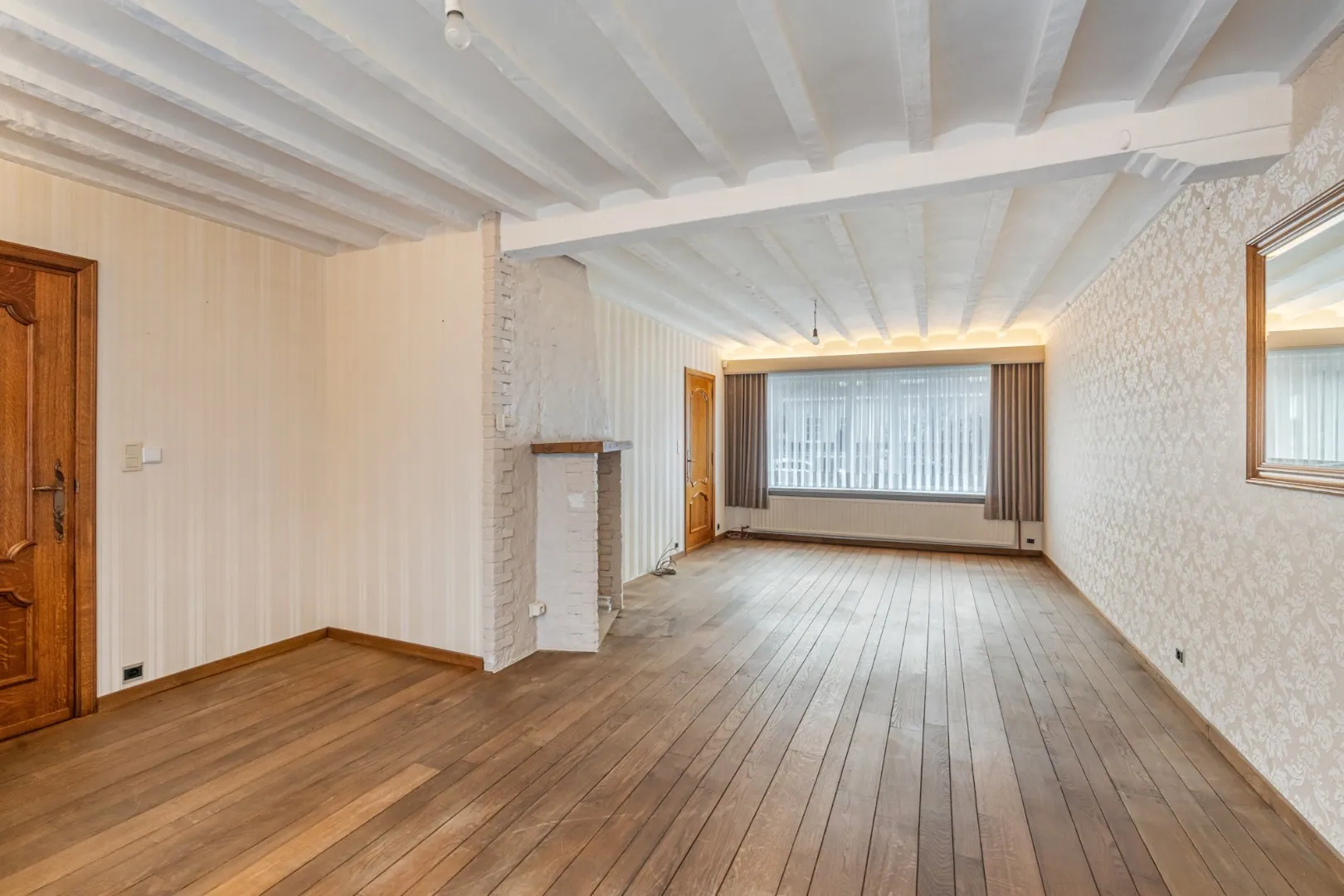 De woonkamer voorziet een stijlvolle, massieve parketvloer. Er is een rookkanaal voorzien hetgeen diverse mogelijkheden biedt (pelletkachel, gashaard,..)