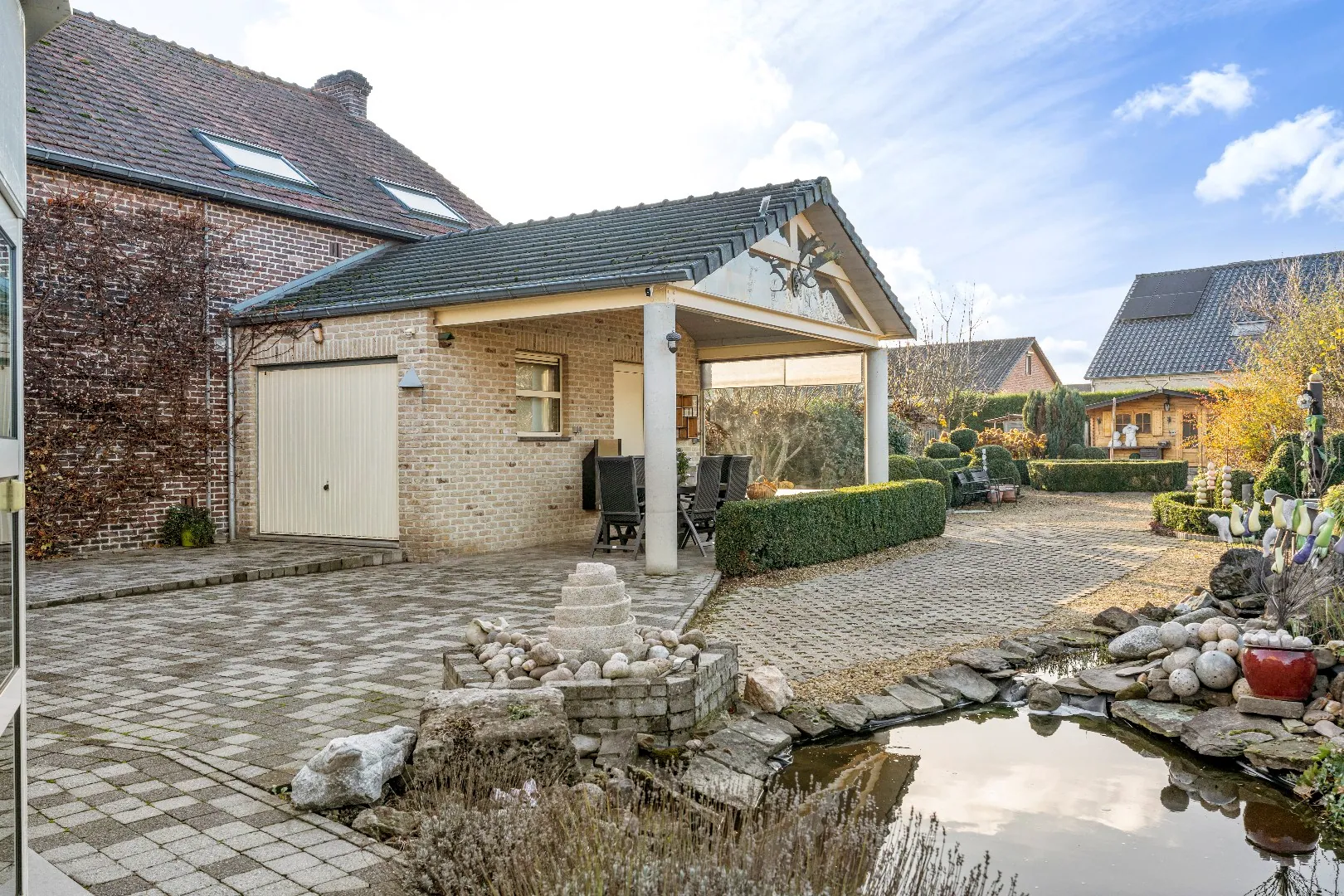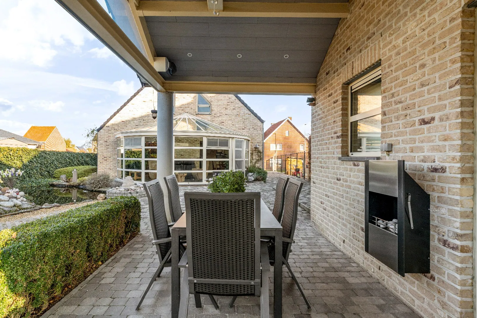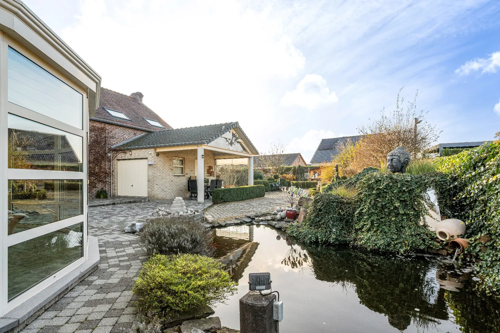 De volgroeide, goed onderhouden tuin vormt een echte troef: u wandelt van de mooie visvijver naar het overdekte loungeterras en garage, met daarachter een verhoogde kruidenzone en een kwalitatief tuinhuis. Achteraan bevindt zich discreet de aangelegde composthoek.