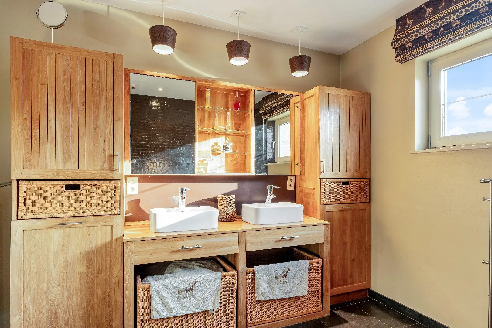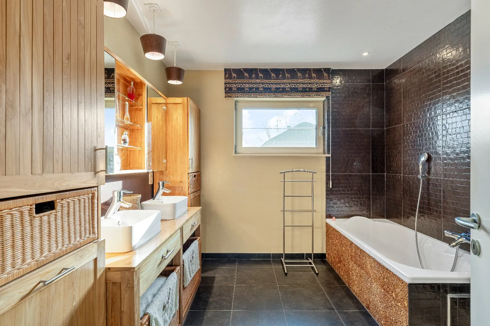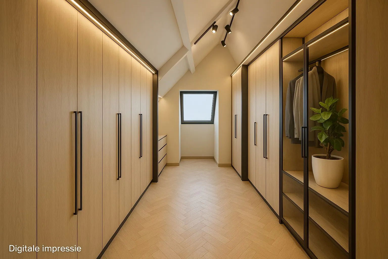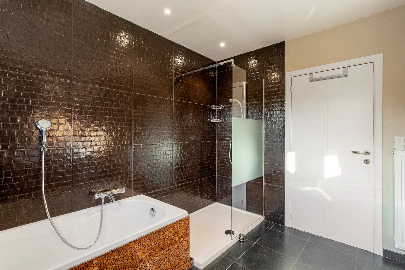 Eyecatcher: de kwaliteitsvolle, hedendaagse badkamer in warme houtaccenten en stijlvolle zwarttinten. Voorzien van een dubbel badkamermeubel met geïntegreerde linnenkasten, spiegelkasten, een ligbad én een ruime inloopdouche. Daarnaast zorgen verfijnde geïntegreerde maatwerkkasten voor een elegante en praktische afwerking. Via de doorgang stappen we verder naar een mooi ingerichte slaapkamer met dressing, een multifunctionele kamer (bureau/hobby) en een aparte voorraadkamer.