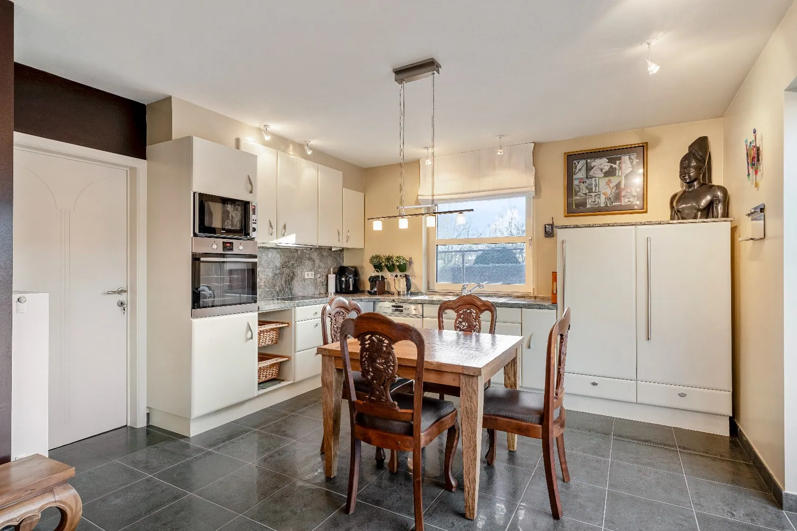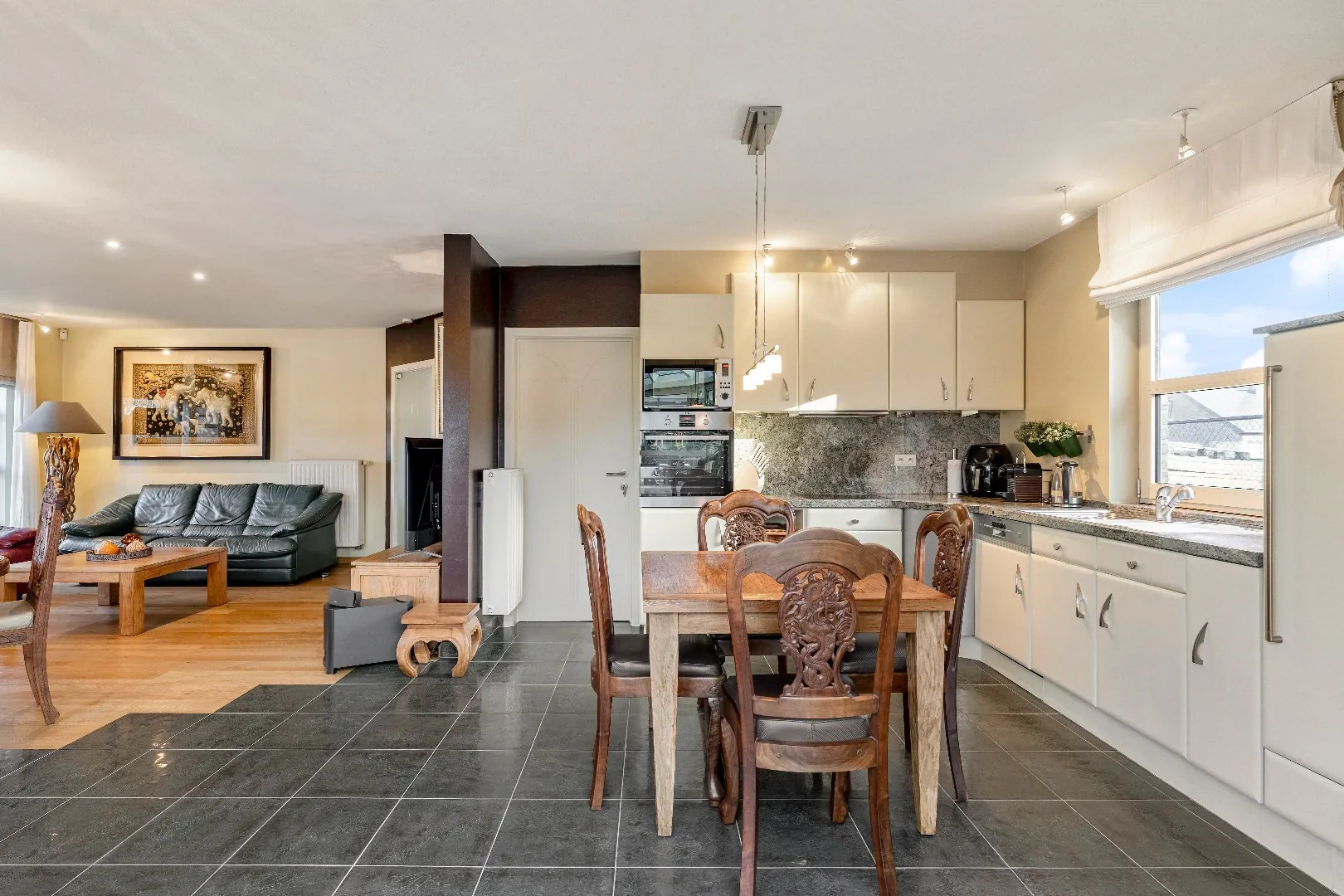 Op het gelijkvloers vloeien de leefruimte, veranda en geïntegreerde landelijke keuken in elkaar over. De ruime veranda biedt een wijds zicht op de mooi aangelegde tuin met visvijver en loungeterras, wat het binnen-buitengevoel versterkt.
