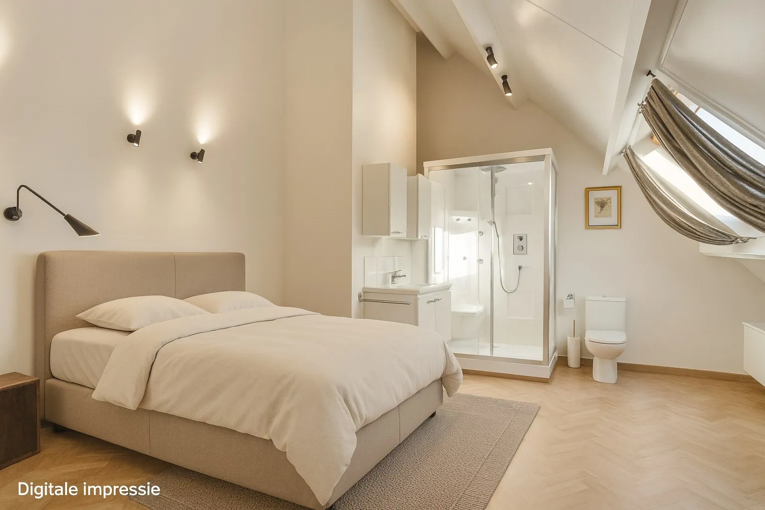 Uniek kenmerk: de kamers hebben geen klassieke plafonds, maar lopen volledig door tot in de nok. Dit zorgt voor een open, luchtige en unieke sfeer.