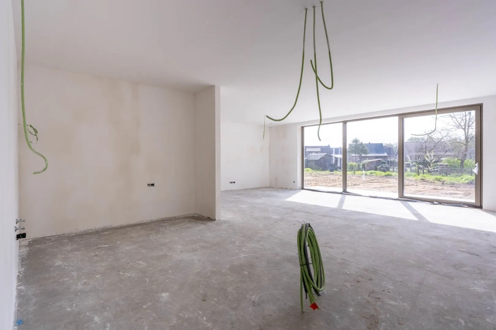 - In de casco + afwerking zijn uiteraard alle leidingen, afvoeren, ventilatie, verwarming en elektriciteit reeds voorzien. De koper dient, in tegenstelling tot bij de volledig afgewerkte woning zelf te voorzien in: Trap, vloeren, keuken, sanitair en binnendeuren